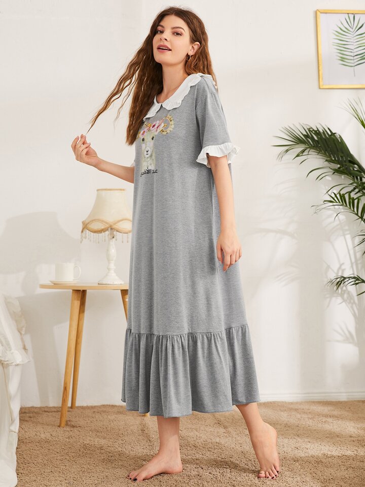 فستان ليلي بطباعة خروف بحافة مكشكش بياقة بن بتر قطعة واحدة