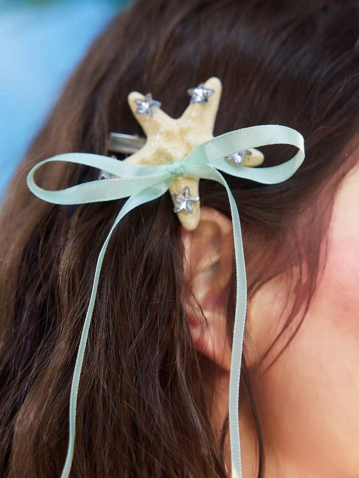 1 قطعة مشبك شعر بتصميم بحري أنيق بشكل نجمة البحر والفيونكة، مشبك شعر بلمعة نجمة، إكسسوار شعر عصري بتصميم الحياة البحرية