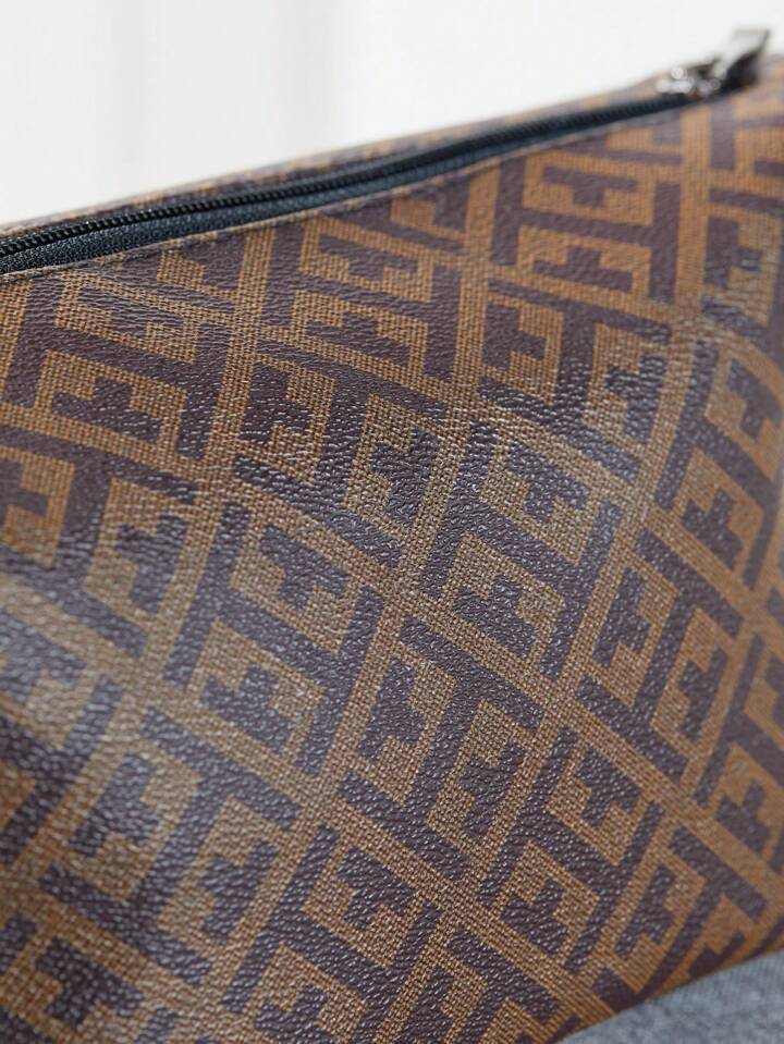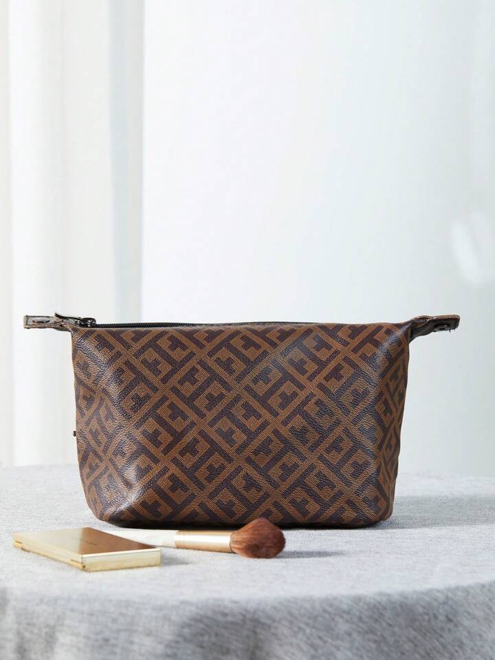 حقيبة مكياج كبيرة بنمط هندسي فاخر باللون البني و بتصميم أوروبي أنيق وبنمط ياباني واسلوب نورديكي عصري بتصميم كلاسيكي يومي، مقاومة للماء، تناسب السيدات والفتيات لتخزين المكياج وتنظيمه، منظم مكياج، محفظة مكياج.
