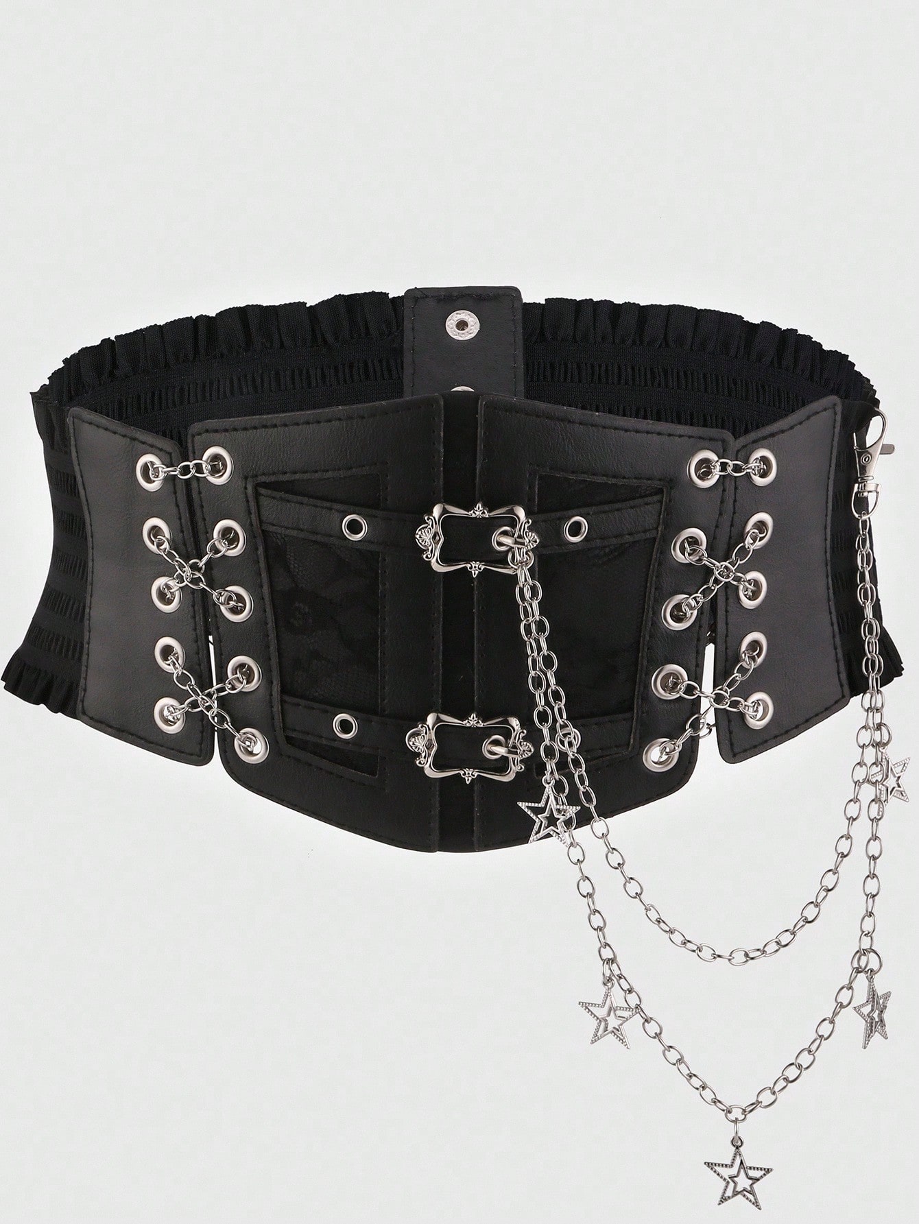 Goth 1 قطعة حزام خصر نسائي بسلسلة من الدانتيل الأسود بتصميم نجمة خماسية مفرغة، بطراز جوثي مطاطي، إكسسوار فستان، إكسسوار لزي هالوين، مشدّ الخصر
