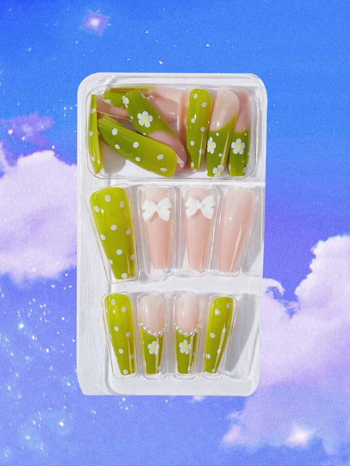 أظافر اصطناعية نمط زهري ورقة الشريط مع قطعة ملف الأظافر 24 قطعة