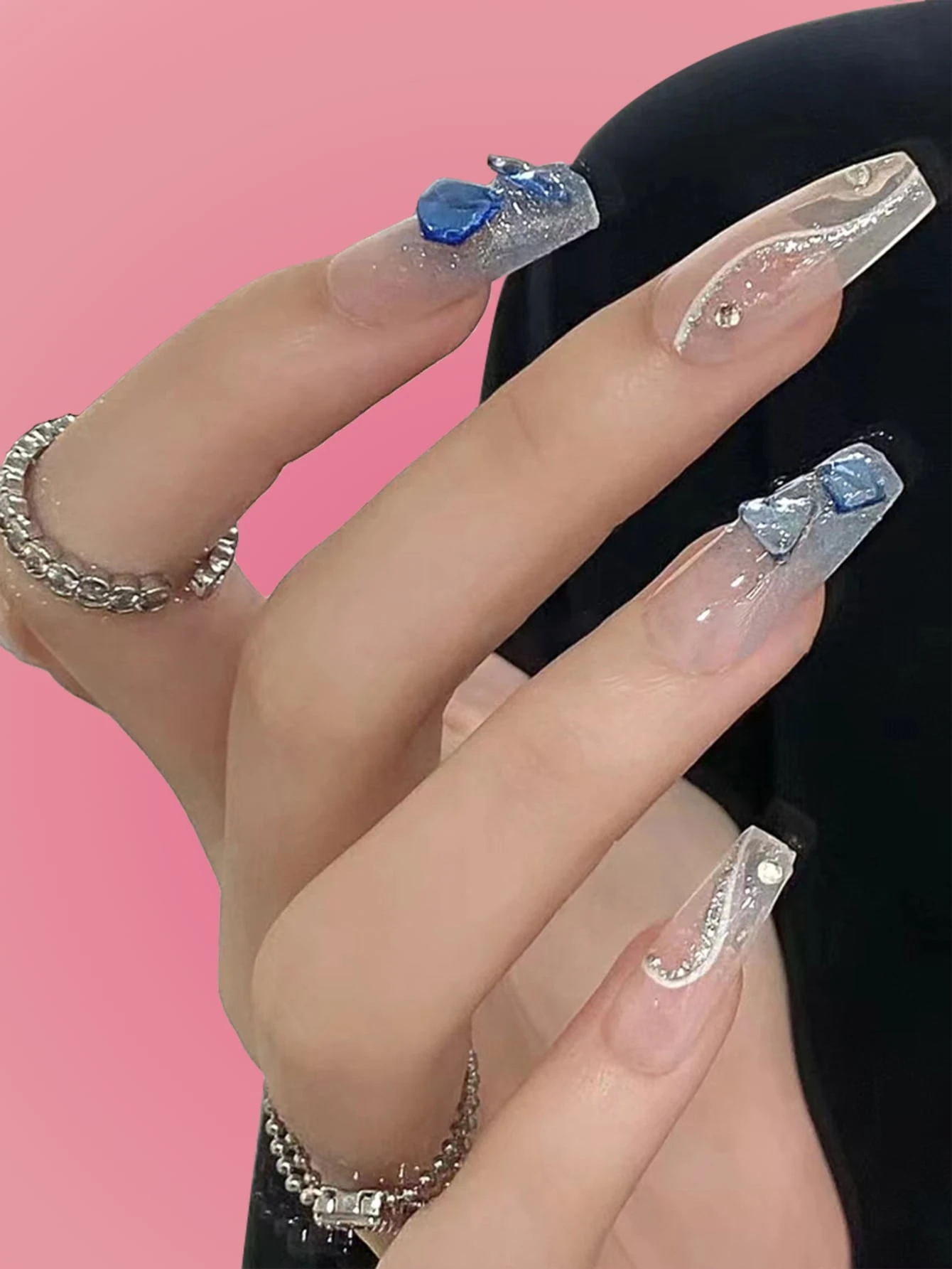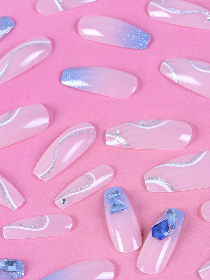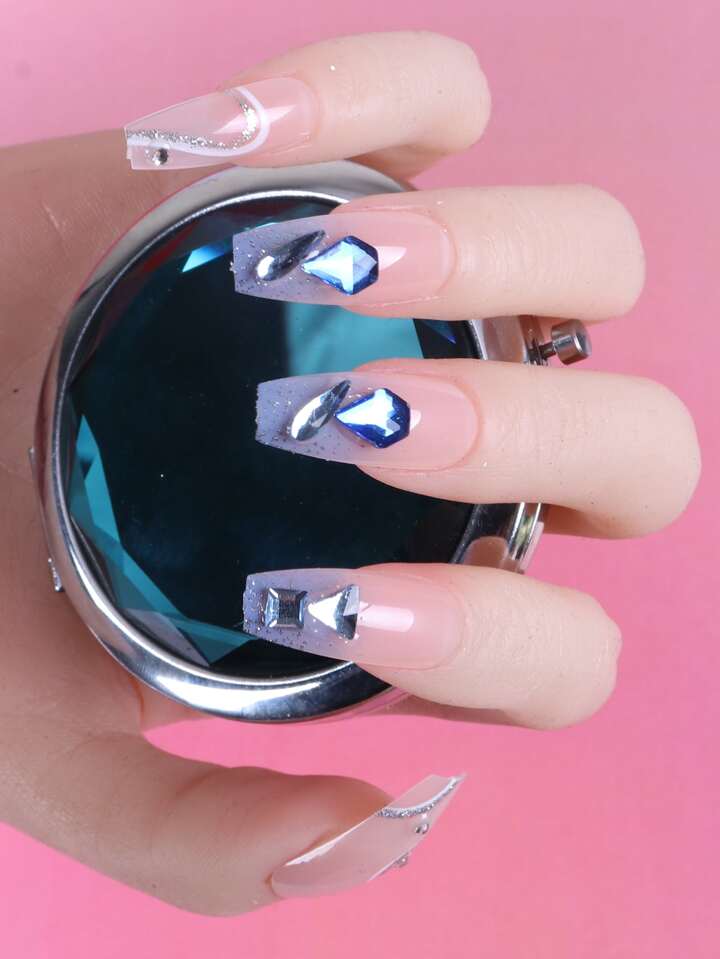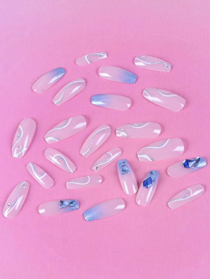 أظافر اصطناعية طويل نعش بديكور حجر الراين 24 قطعة و شريط ورقة واحدة