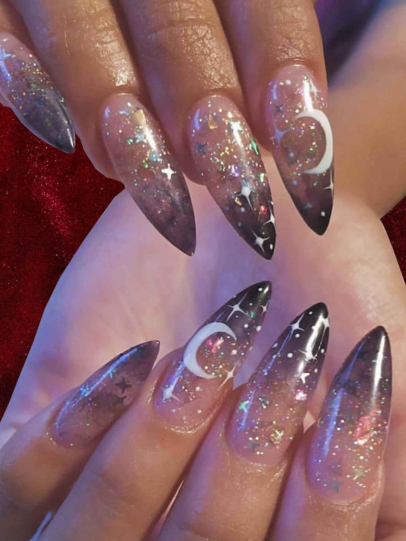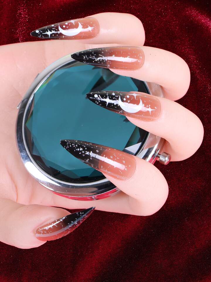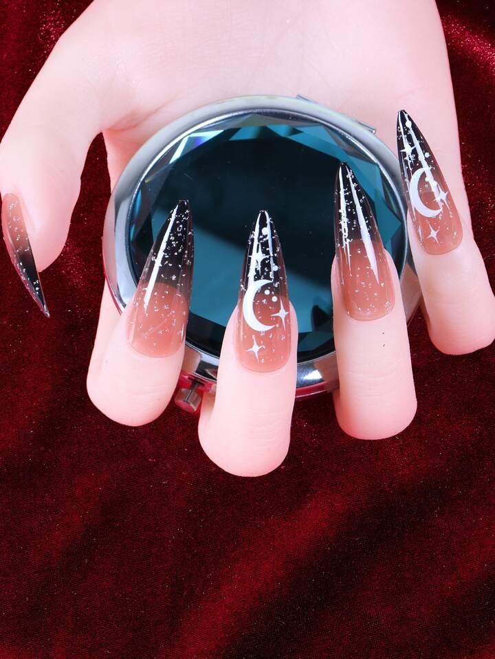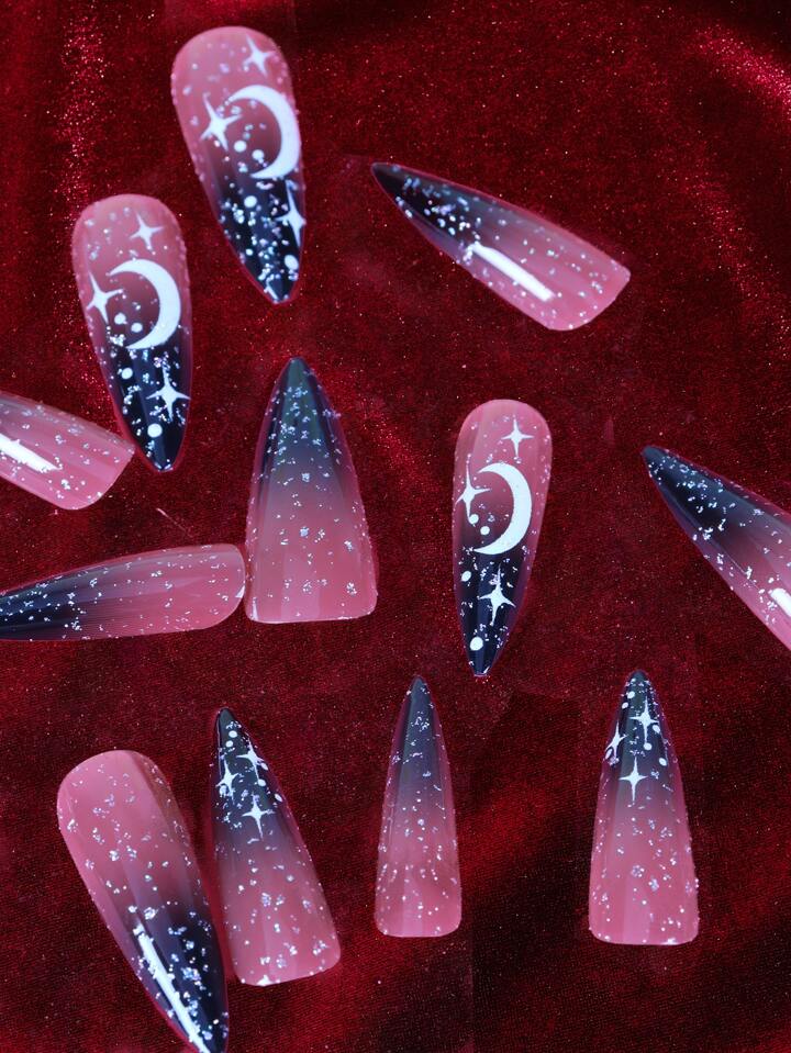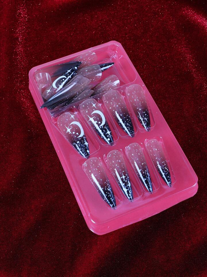 أظافر اصطناعية طويل خنجر نمط قمر ونجم 24 قطعة و شريط ورقة واحدة