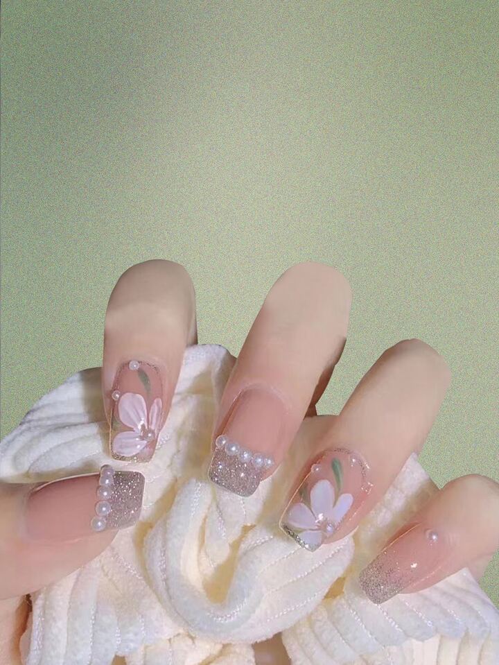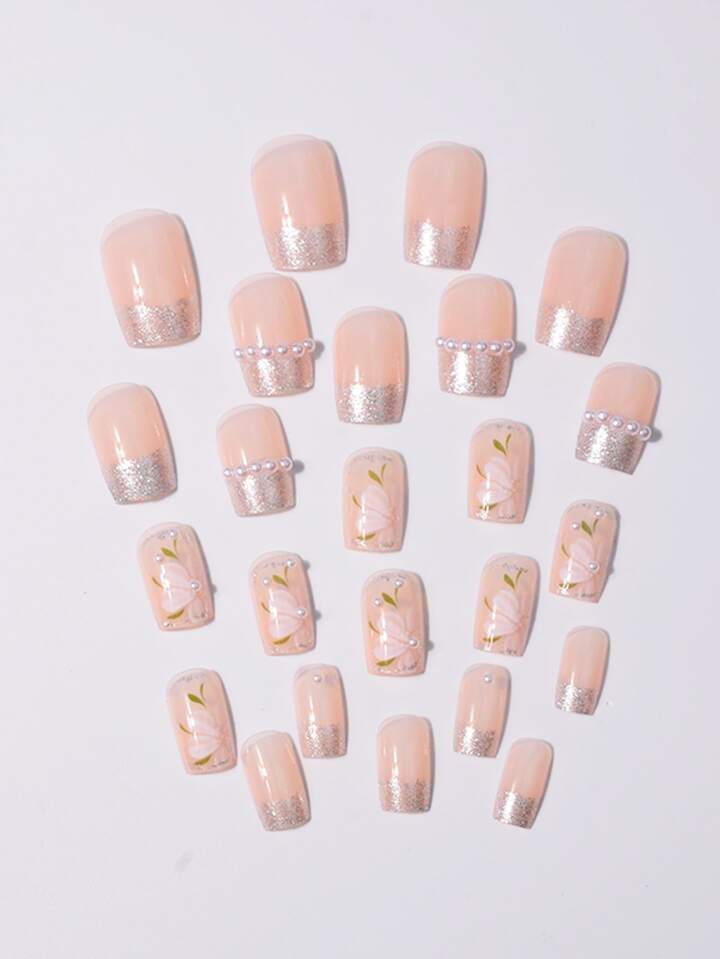 أظافر المزيفة المربعة والقصيرة بطباعة الزهر 24قطع مع الشريط