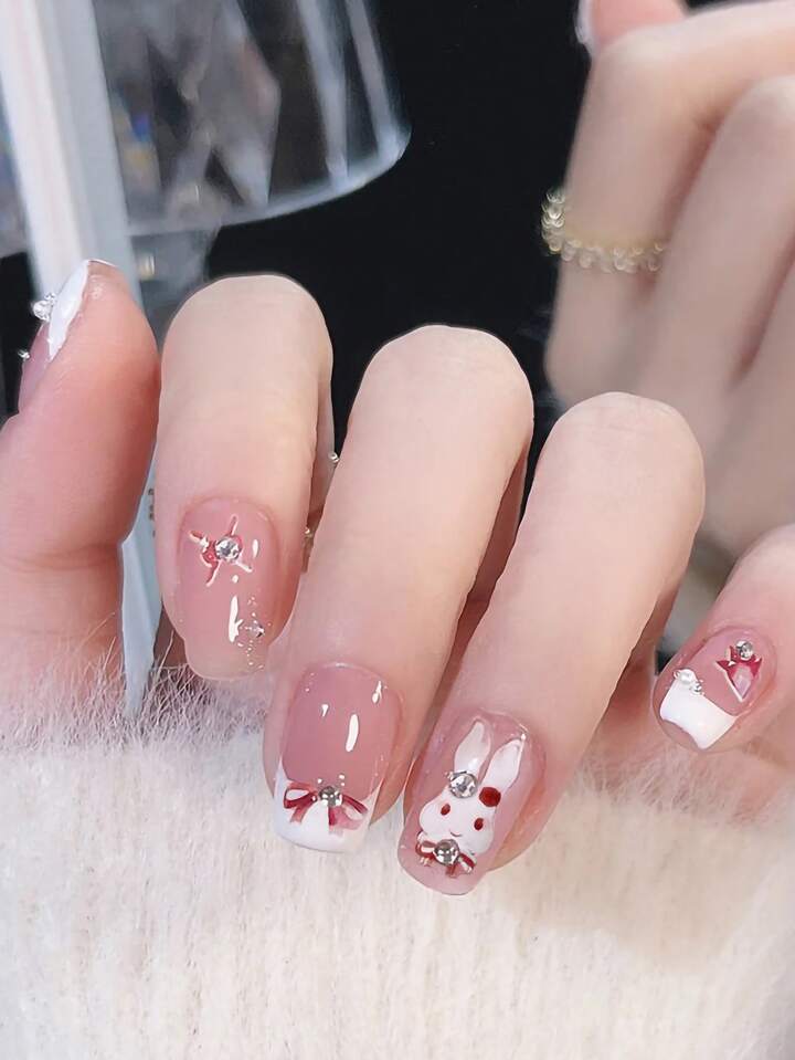 24 قطعة قصير مربع طباعة الأرنب أظافر اصطناعية و ورقة واحدة شريط