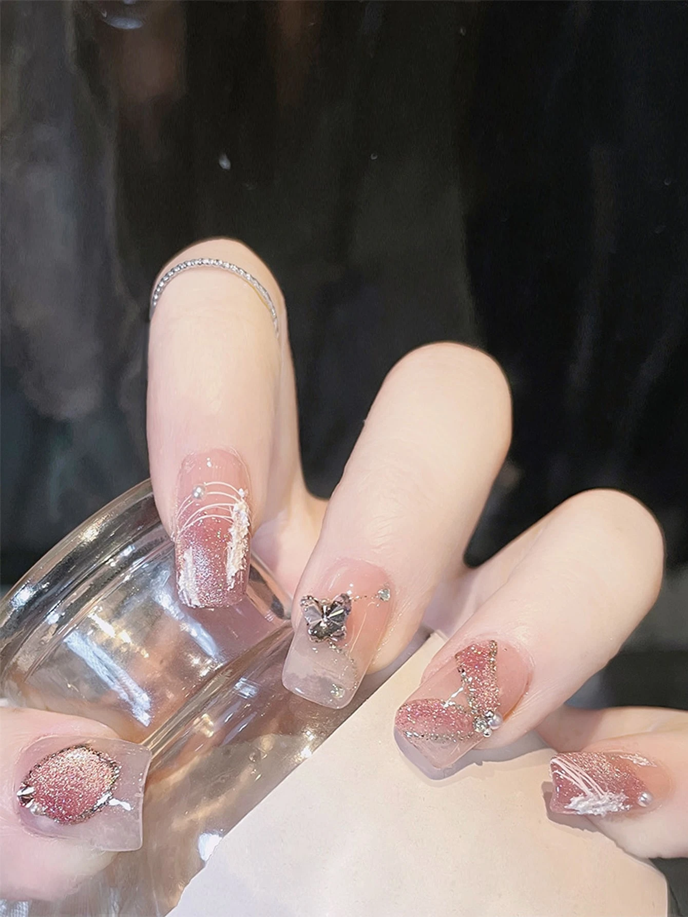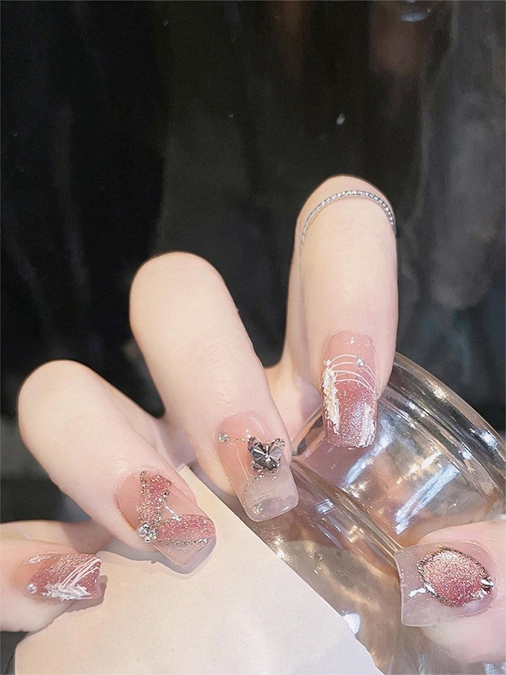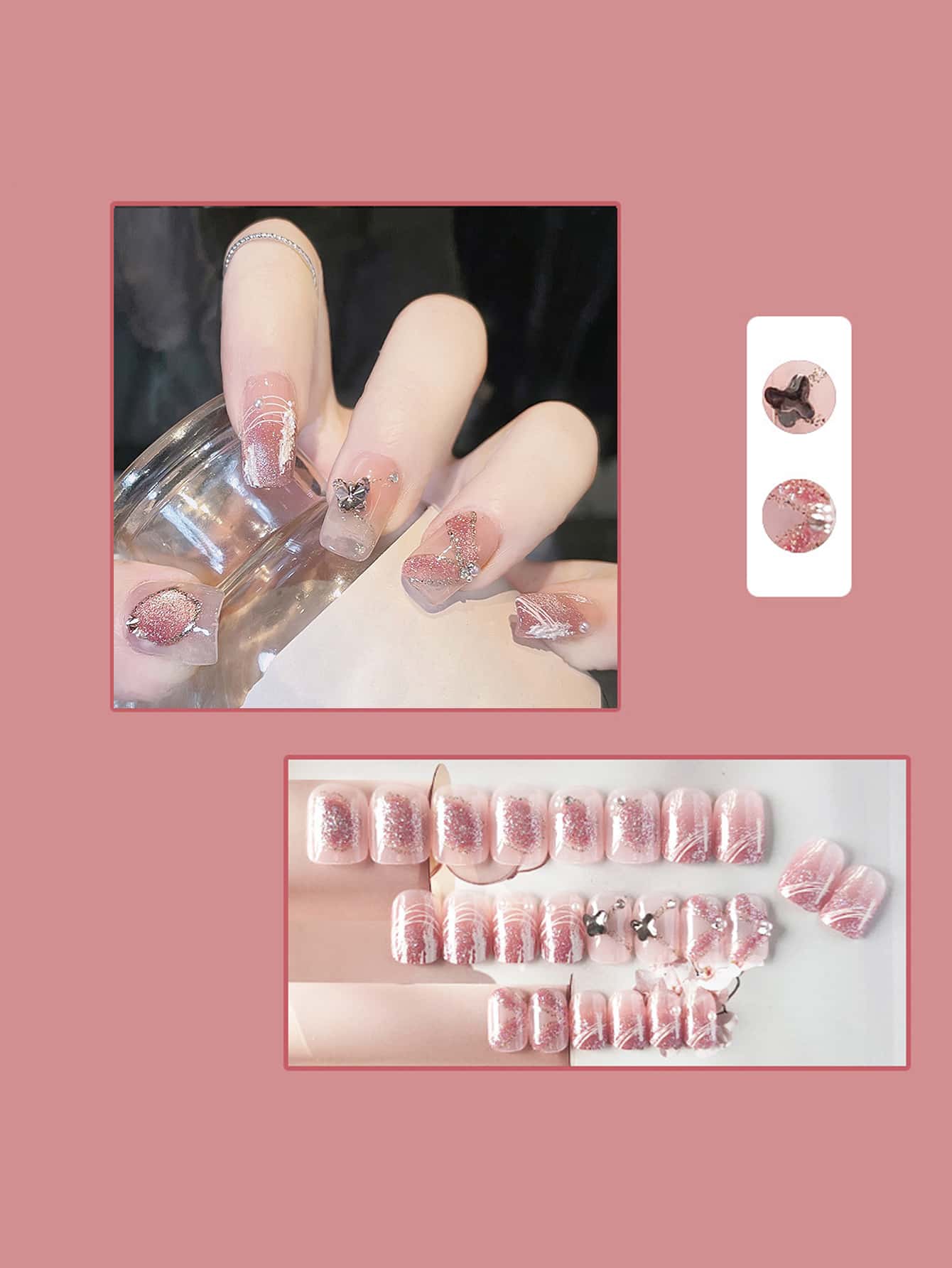 أظافر اصطناعية مربع زخرفة فراشة ثلاثي الأبعاد 24قطع و ورقة واحدة شريط