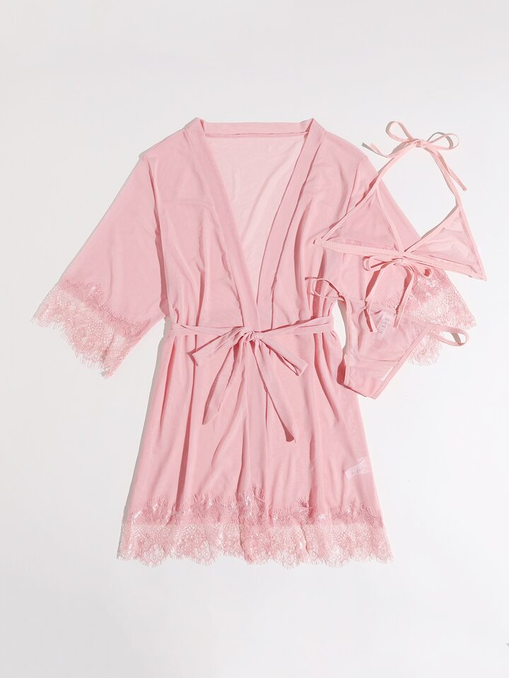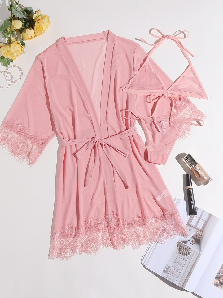 طقم ملابس داخلي لينجري شبكي 3 قطع مع روب مقلم بدانتيل
