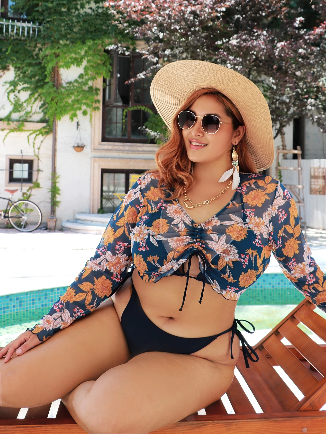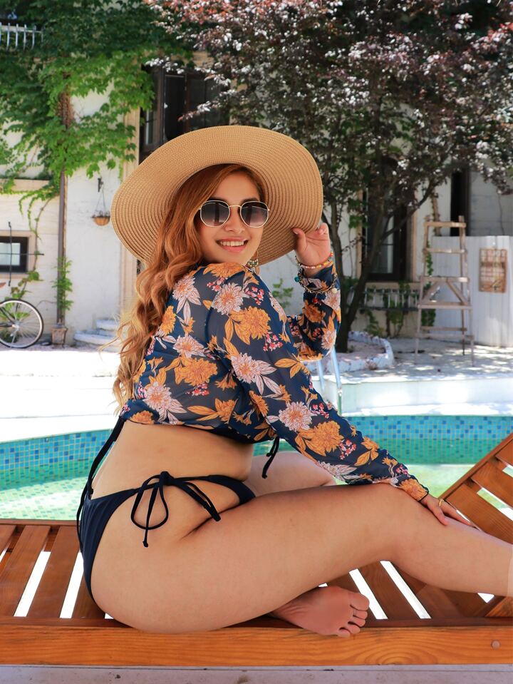 3حزمات بيكيني بفتحة مثلثية بحجم إضافي وتغطية صيفية بنقشة زهرية للشاطئ
