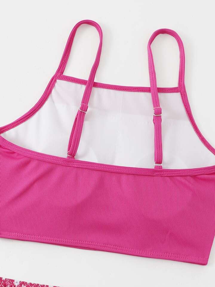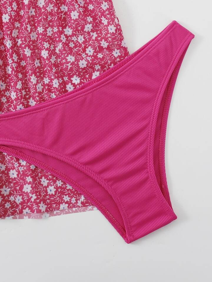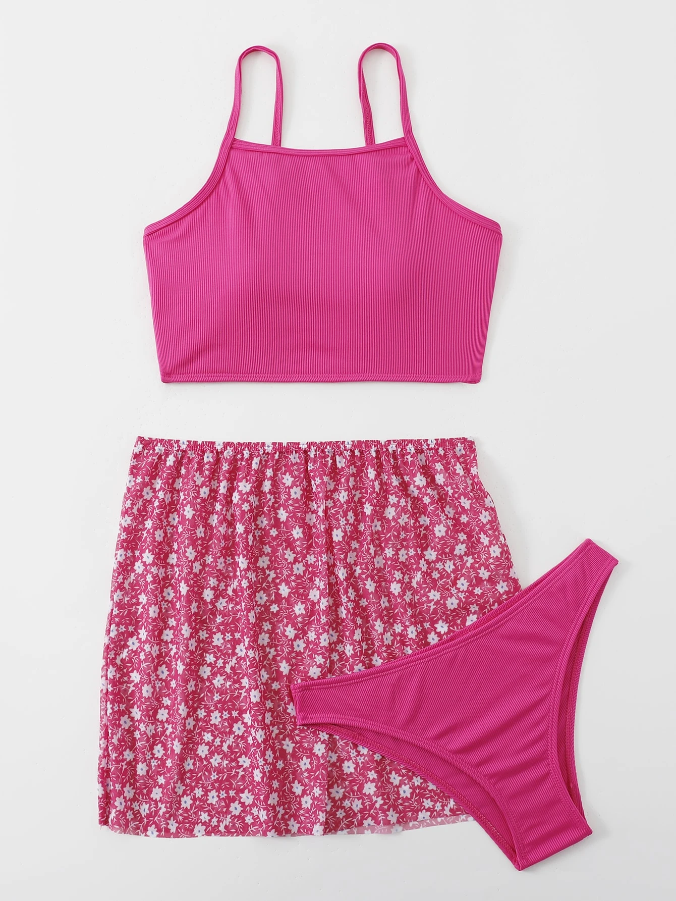مجموعة من ثلاثة بيكينيات أحادية اللون وتنورة شاطئ زهرية صغيرة