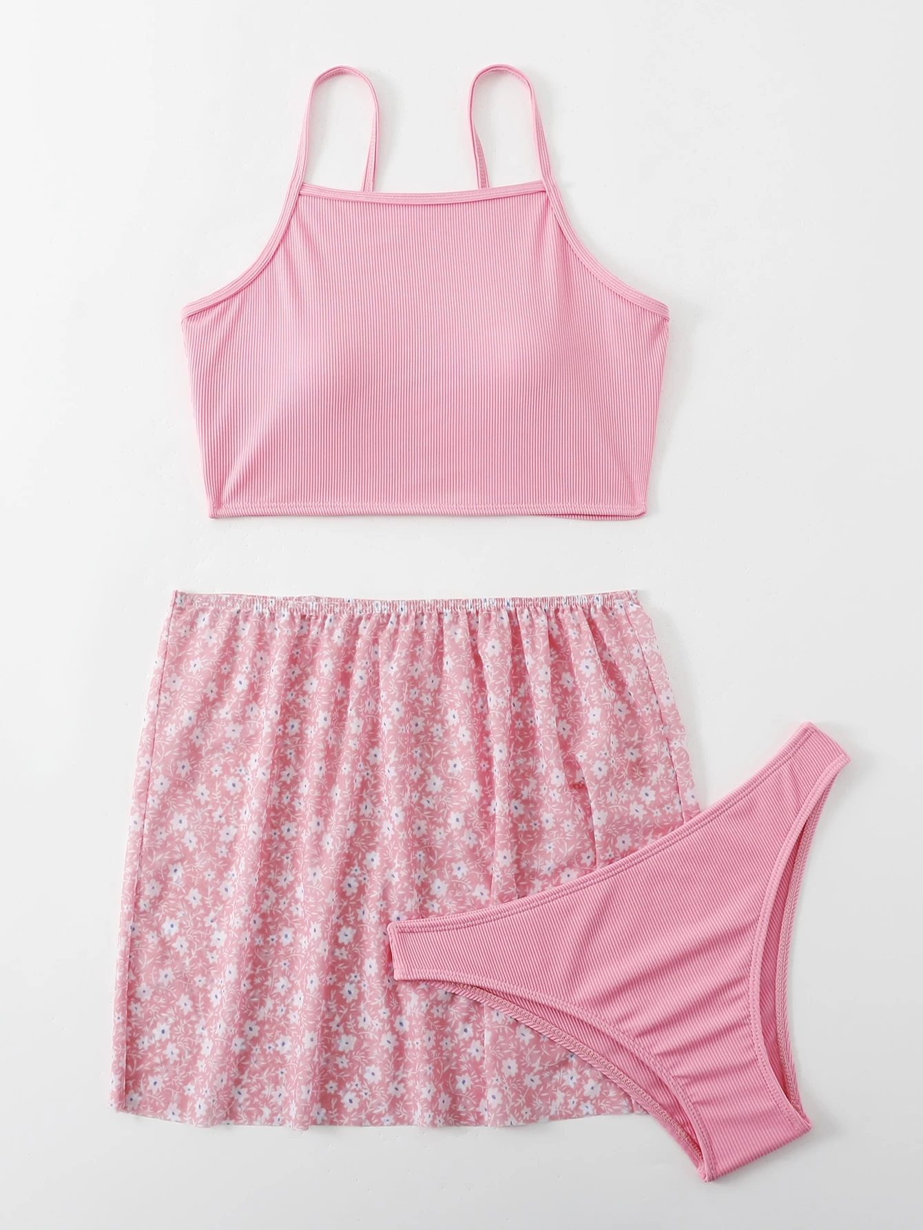 مجموعة من 3 حزم بيكيني صلب وتنورة شاطئ زهرية