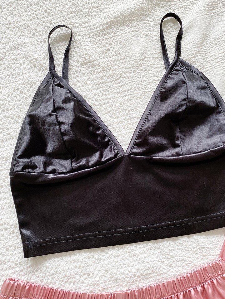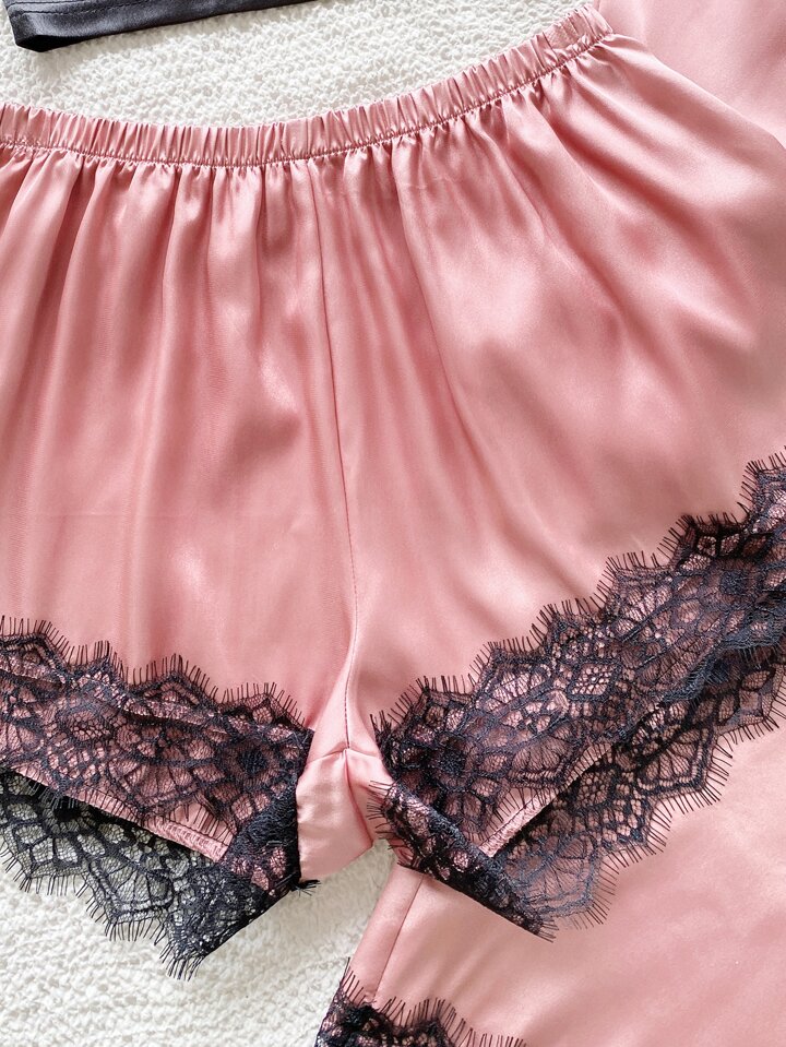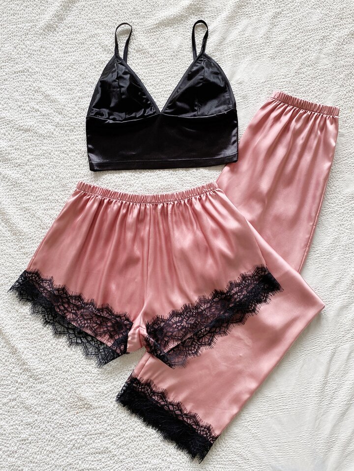 طقم بيجامة ساتان مقلم بدانتيل 3 قطع