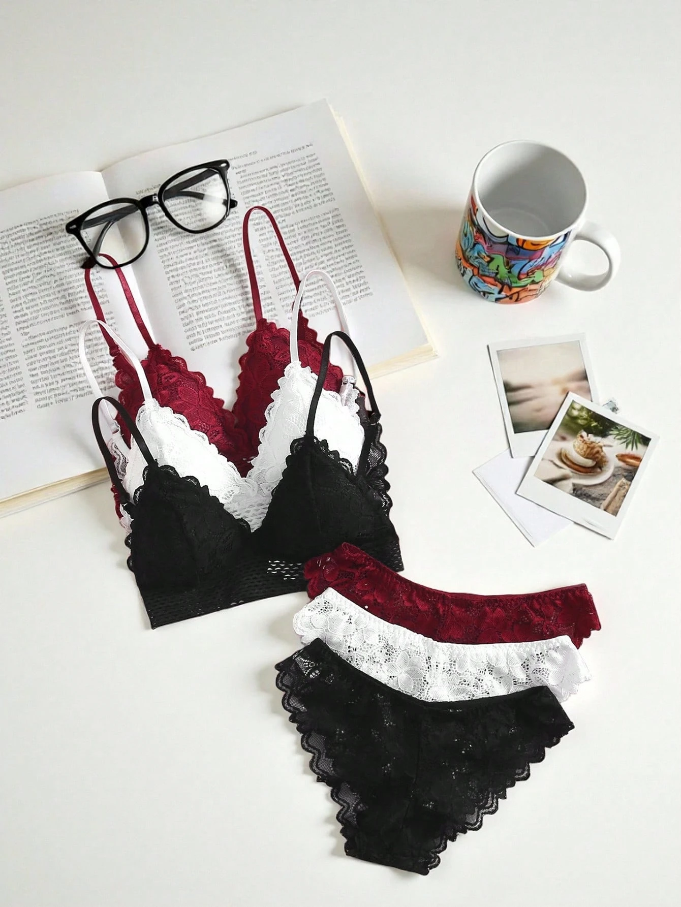 طقم لانجري من البرا والبنطلون بتصميم الدانتيل الزهري 3 قطع