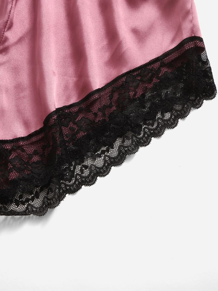 طقم ملابس داخلية ساتان مقلم دانتيل مع روب 6 قطع