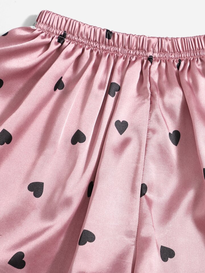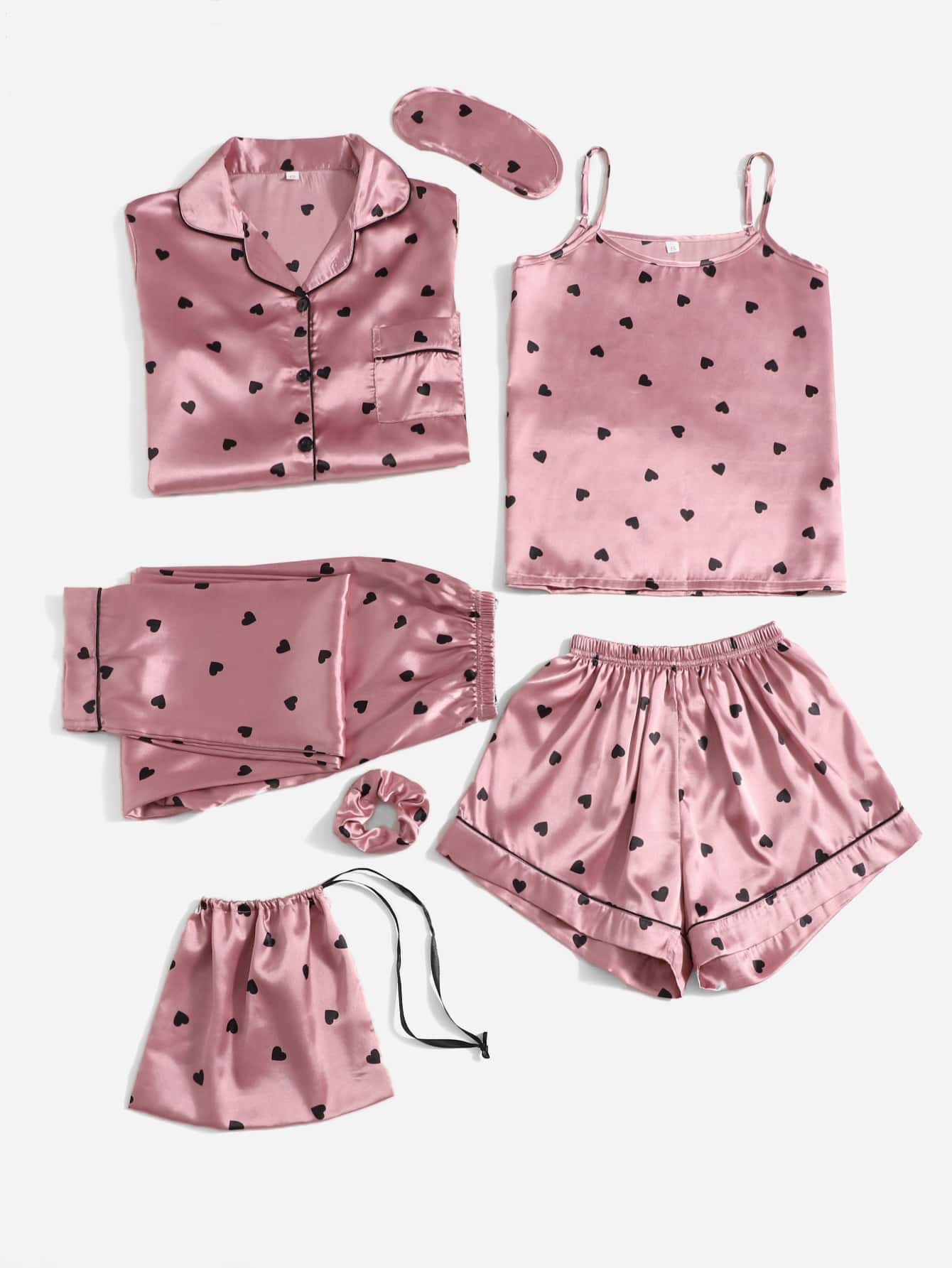 7 قطع طقم بيجاما من القطن الساتان مزين بطباعة قلوب وخطوط ملونة، ملابس شتوية دافئة وأنيقة التفاصيل