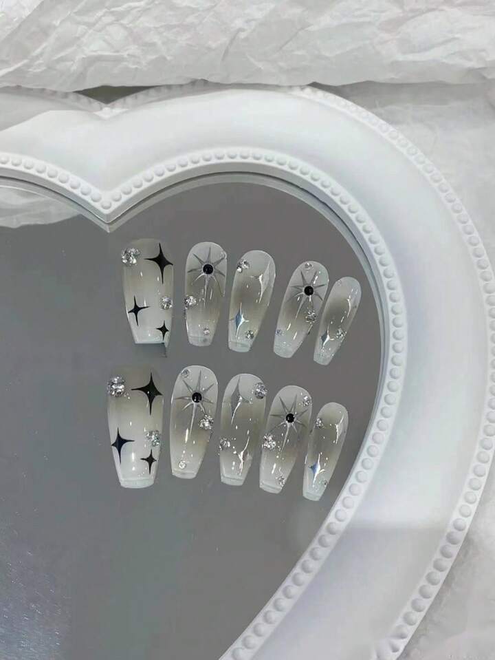Academia 10 قطع طويل نعش ثلاثي الأبعاد بديكور حجر الراين أظافر اصطناعية و ورقة واحدة شريط