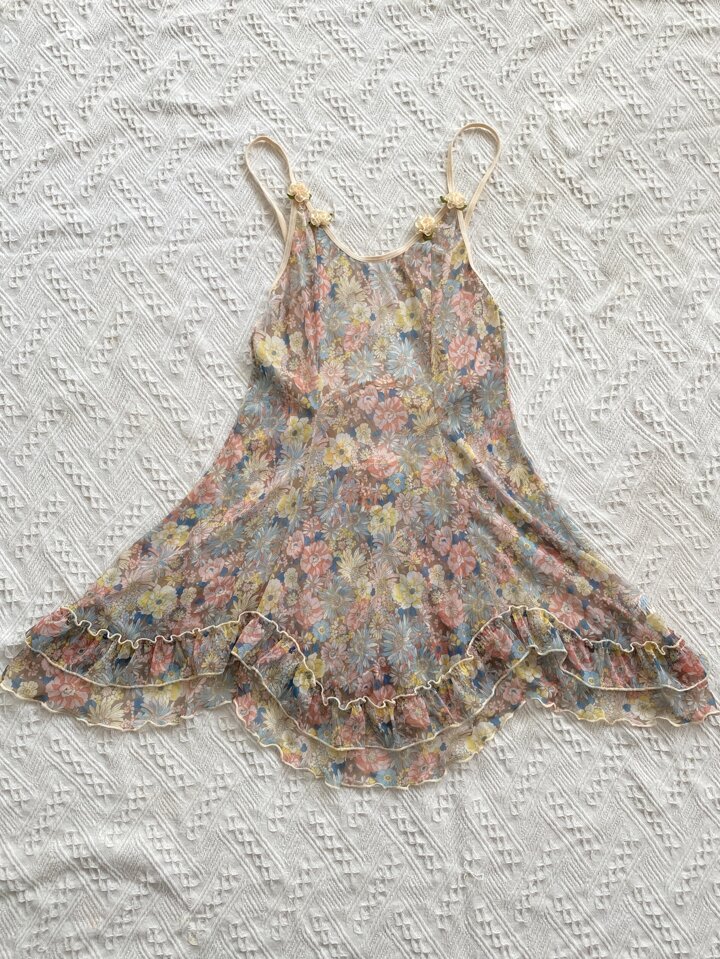 فستان ليلي كامي بطباعة زهر شامل مزين حافة مكشكشة شبكة