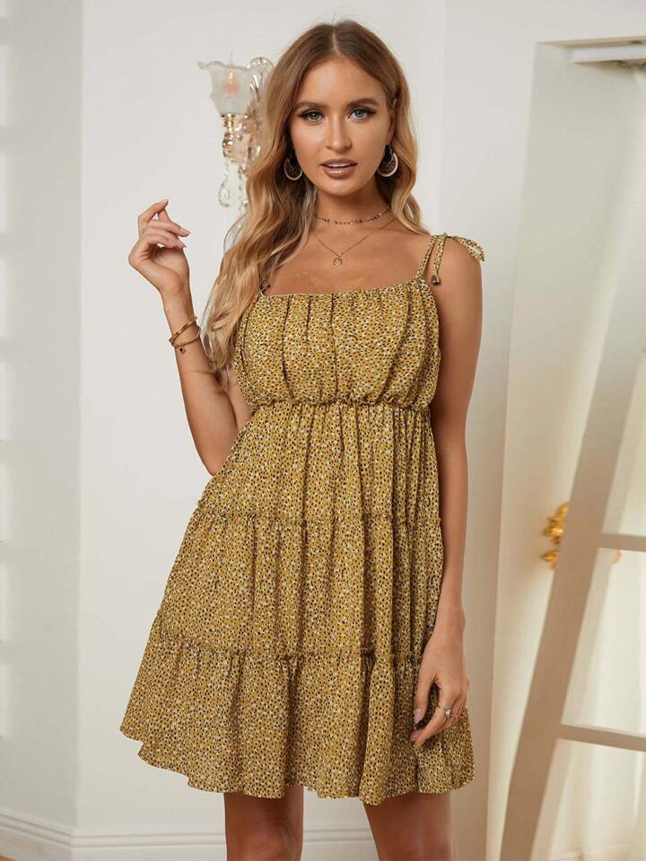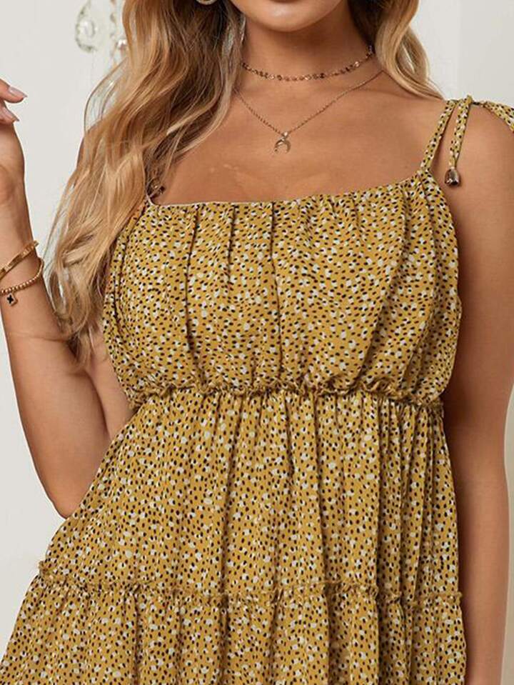 فستان كامي مقلم مكشكش وبطباعة شامل