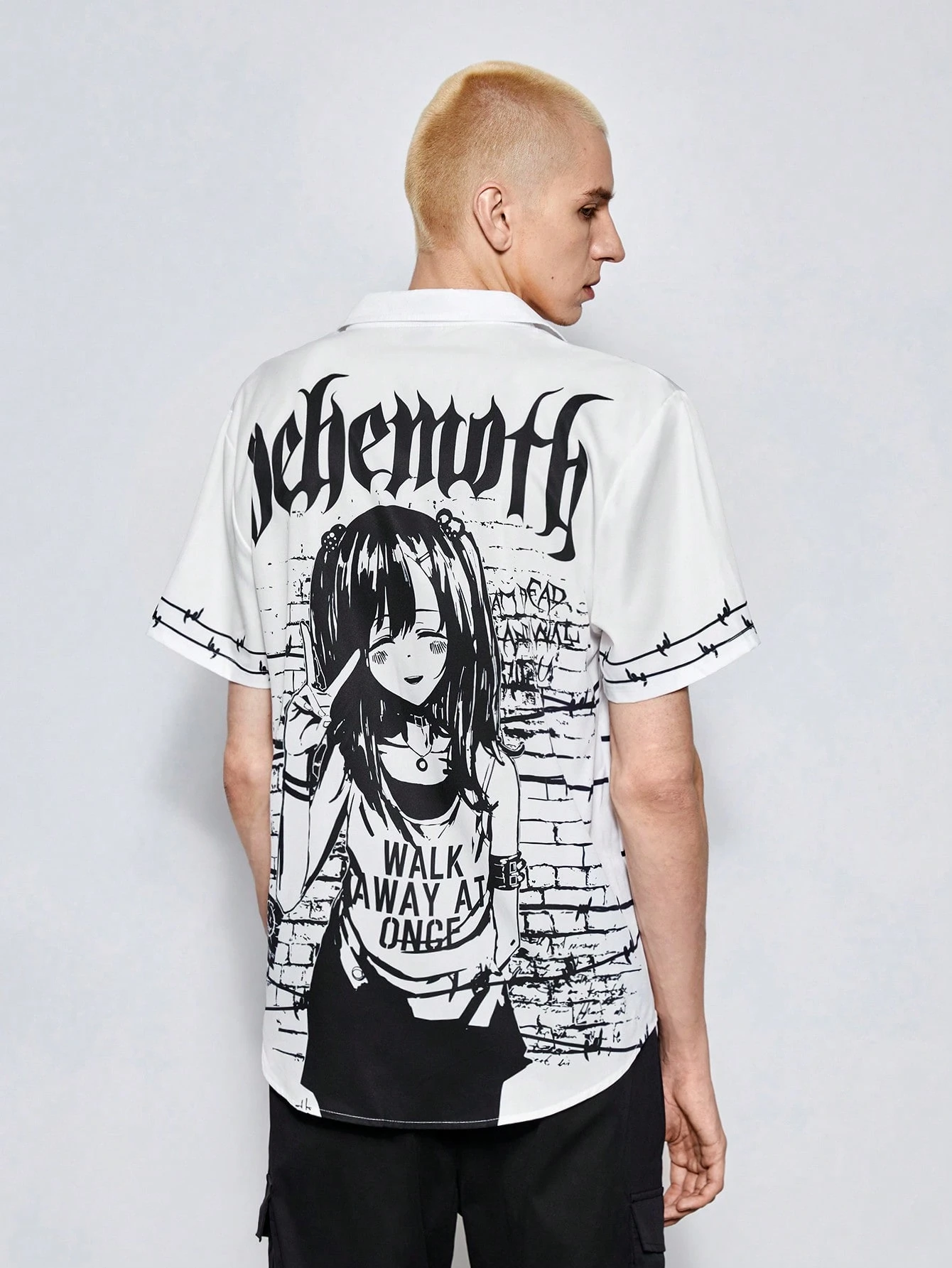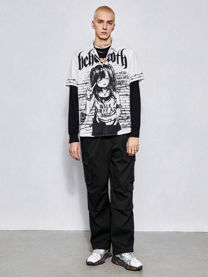 Anime قميص بجرافيك عبارة وشخصية حافة منخفضة وعالي للشباب