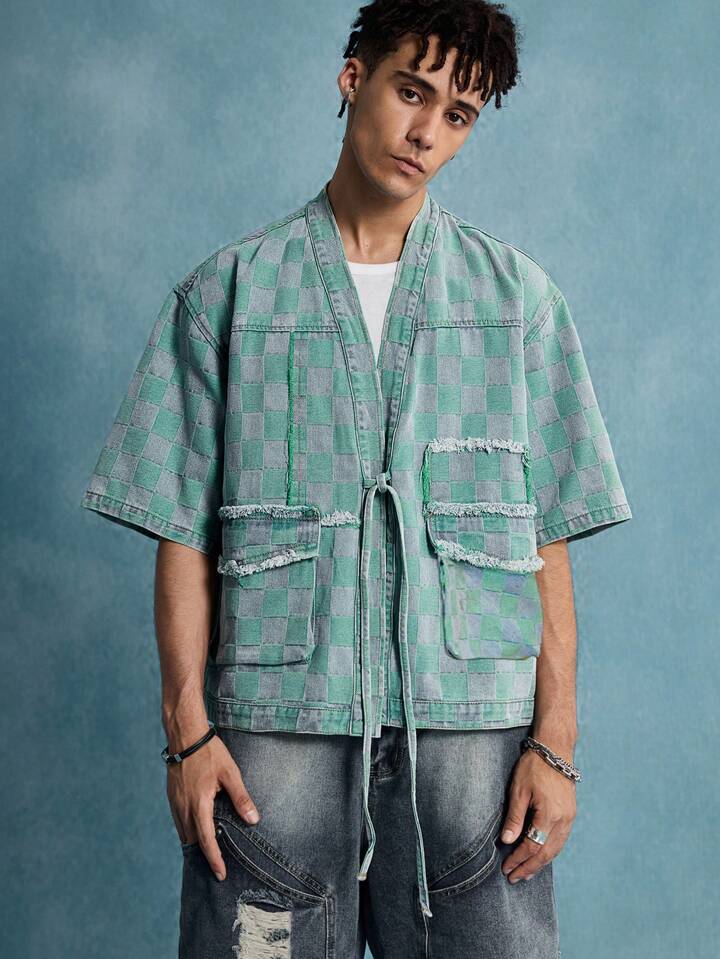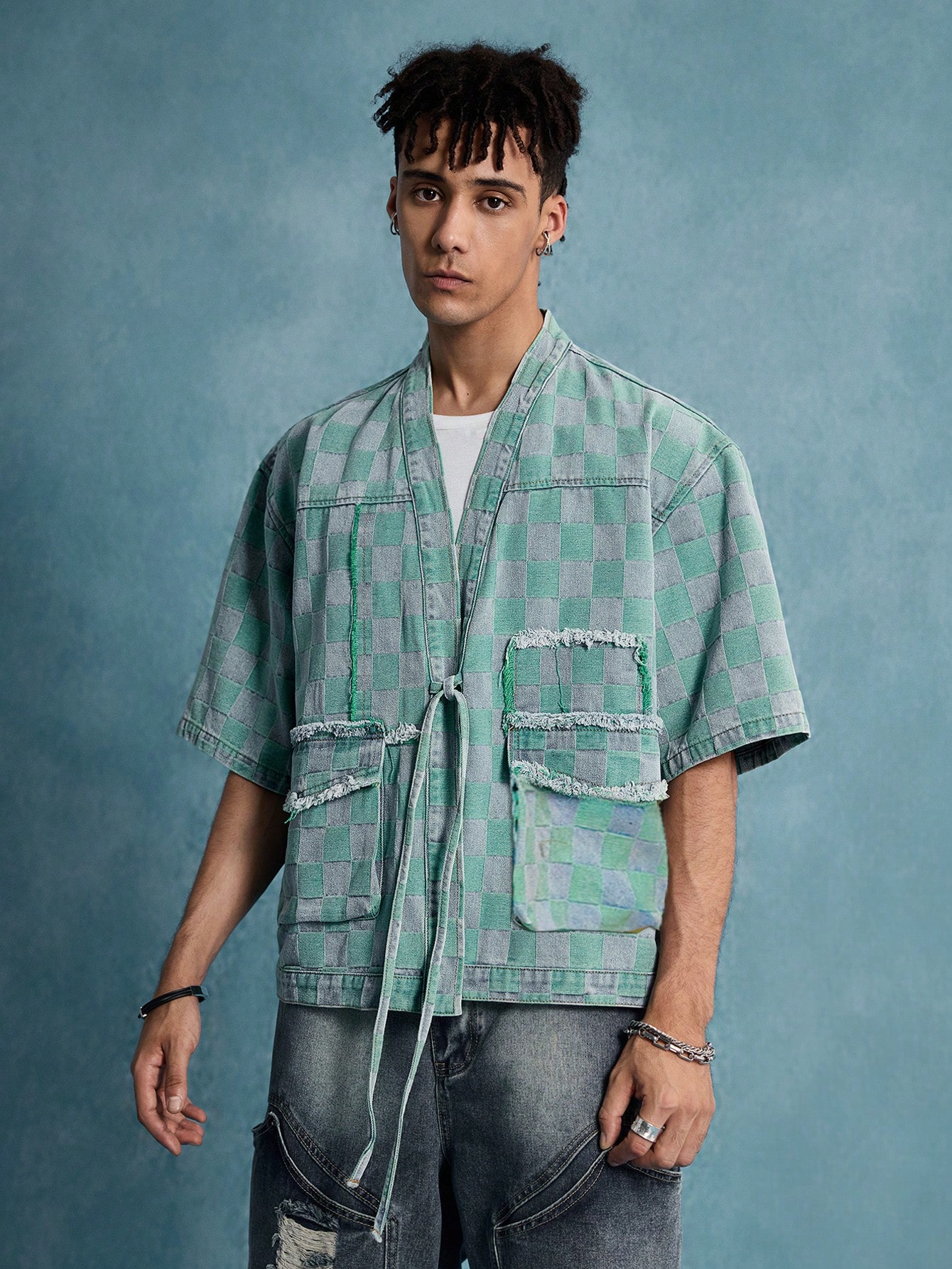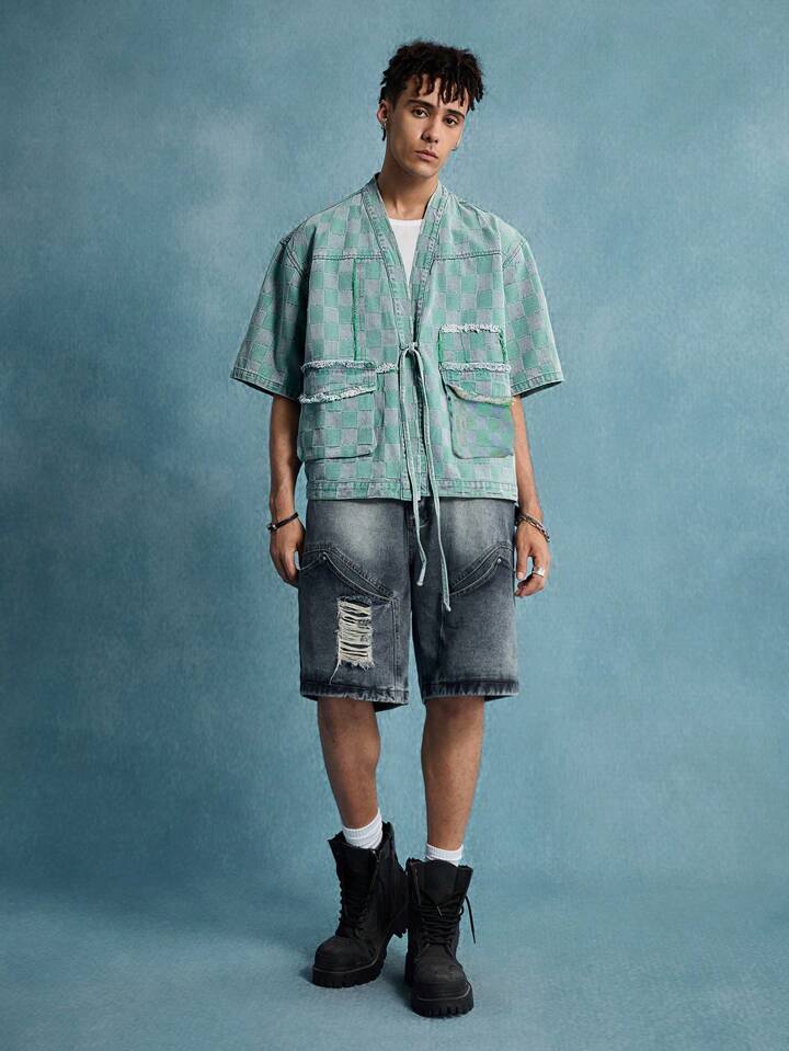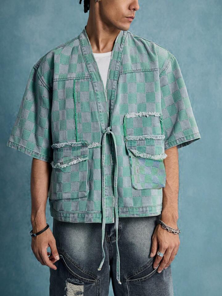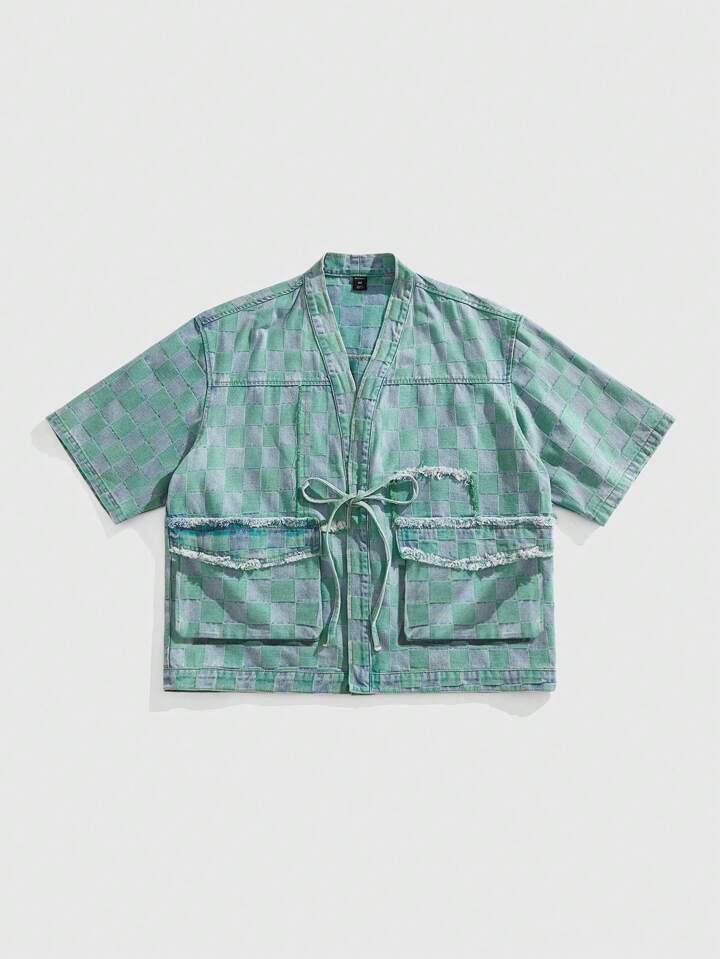 Anime قميص جينز بأكمام قصيرة وجيب مخطط بنقشة الشطرنج وعقدة للرجال