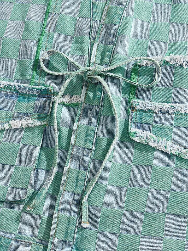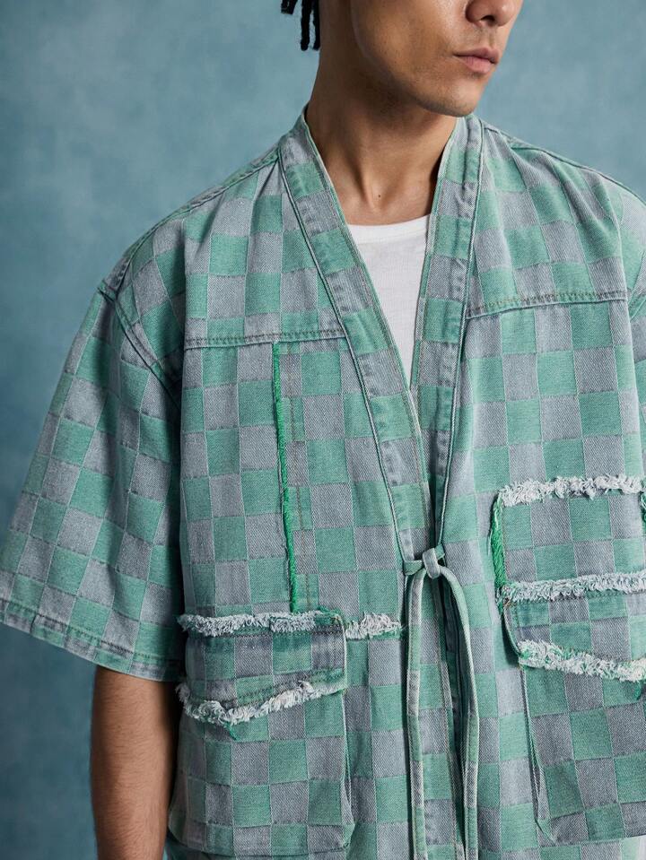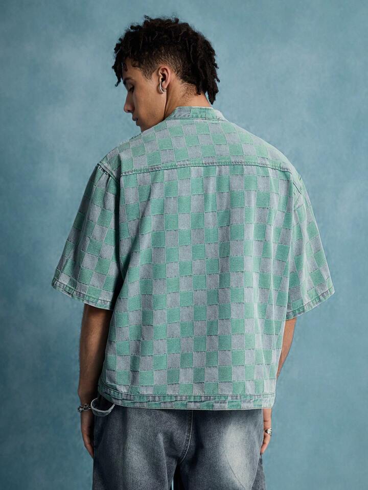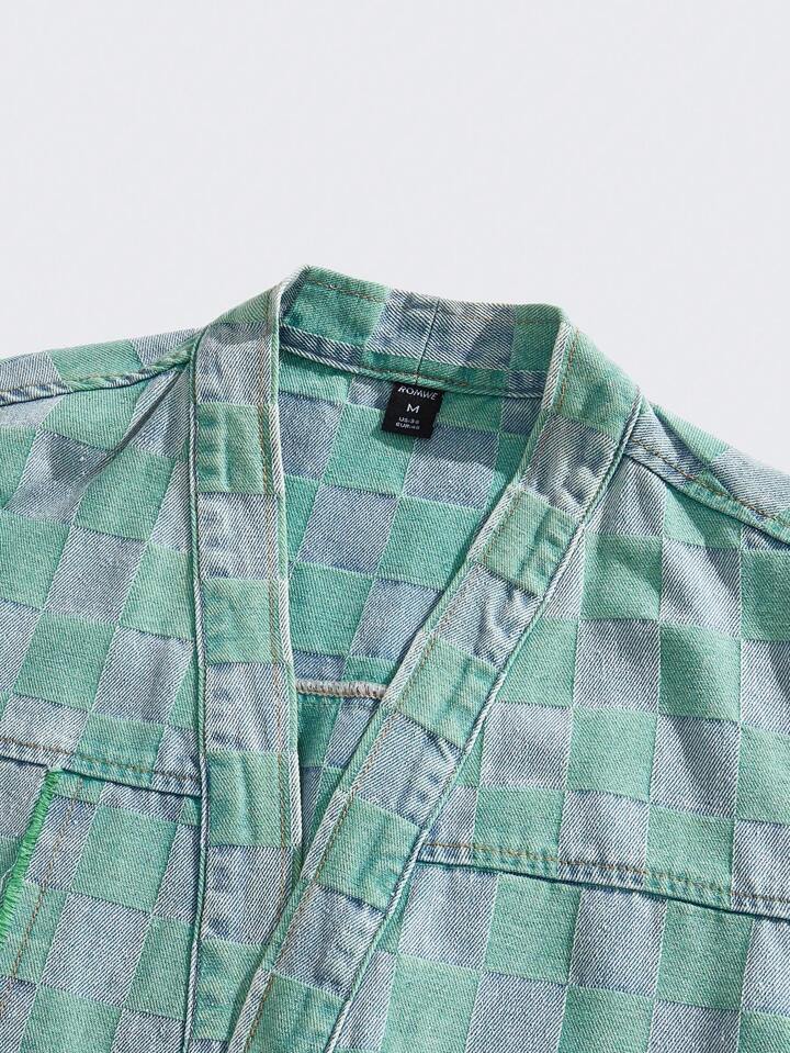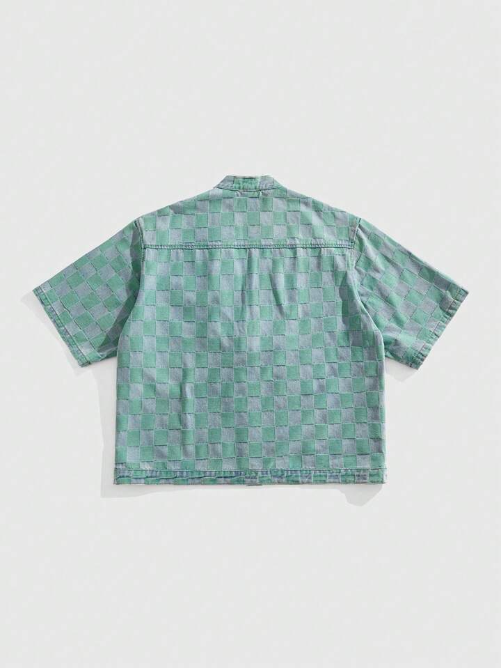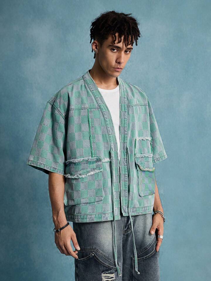 Anime قميص جينز بأكمام قصيرة وجيب مخطط بنقشة الشطرنج وعقدة للرجال