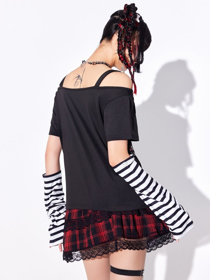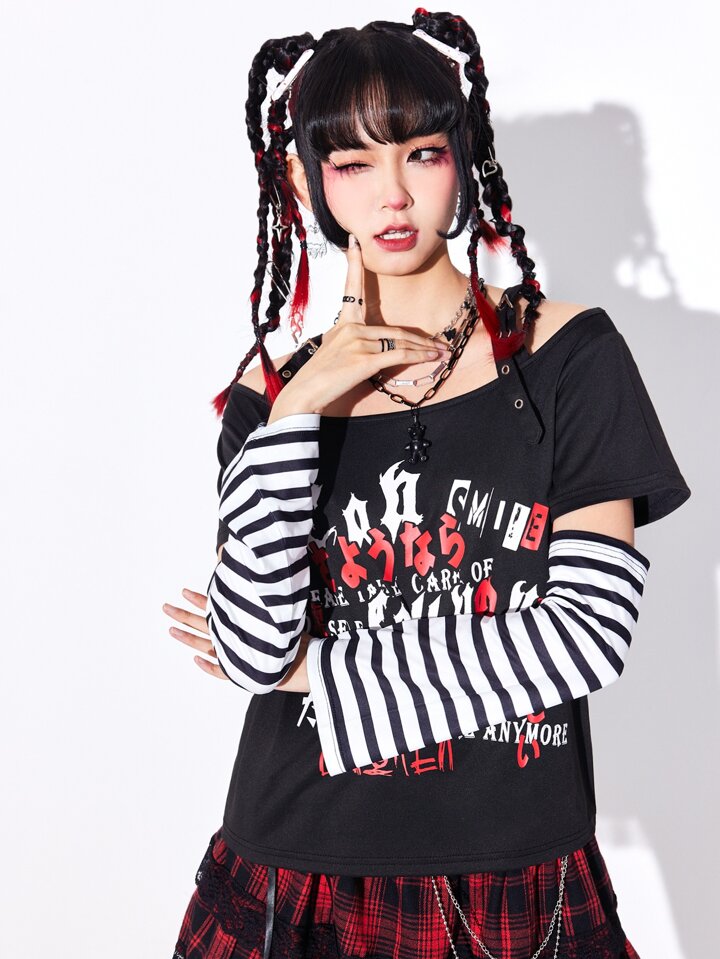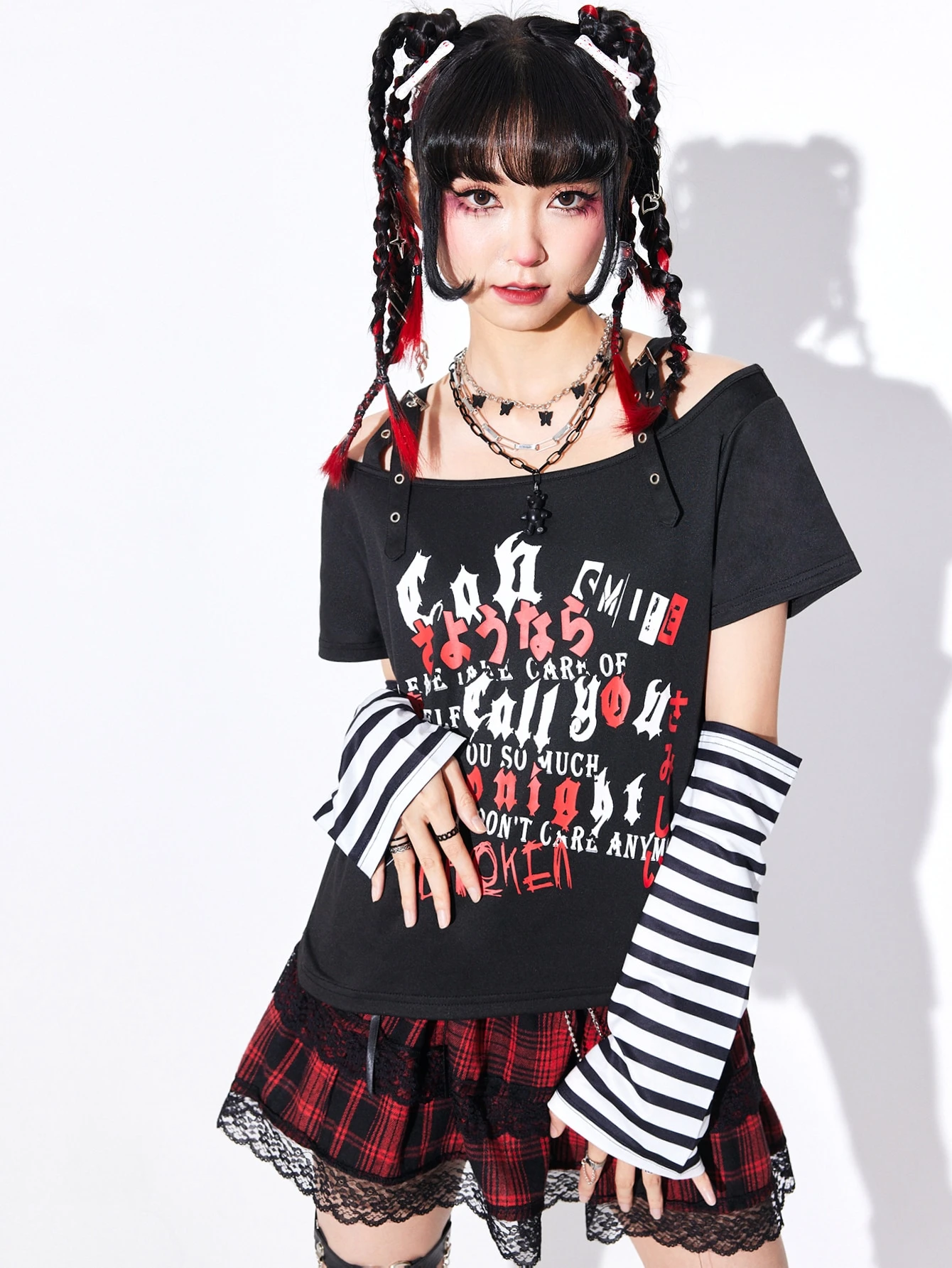 Anime تي شيرت بطباعة شعار كتف مكشوف و أكمام ذراع