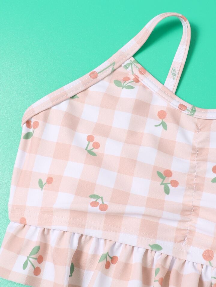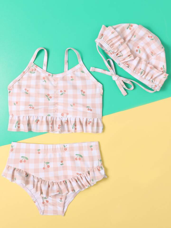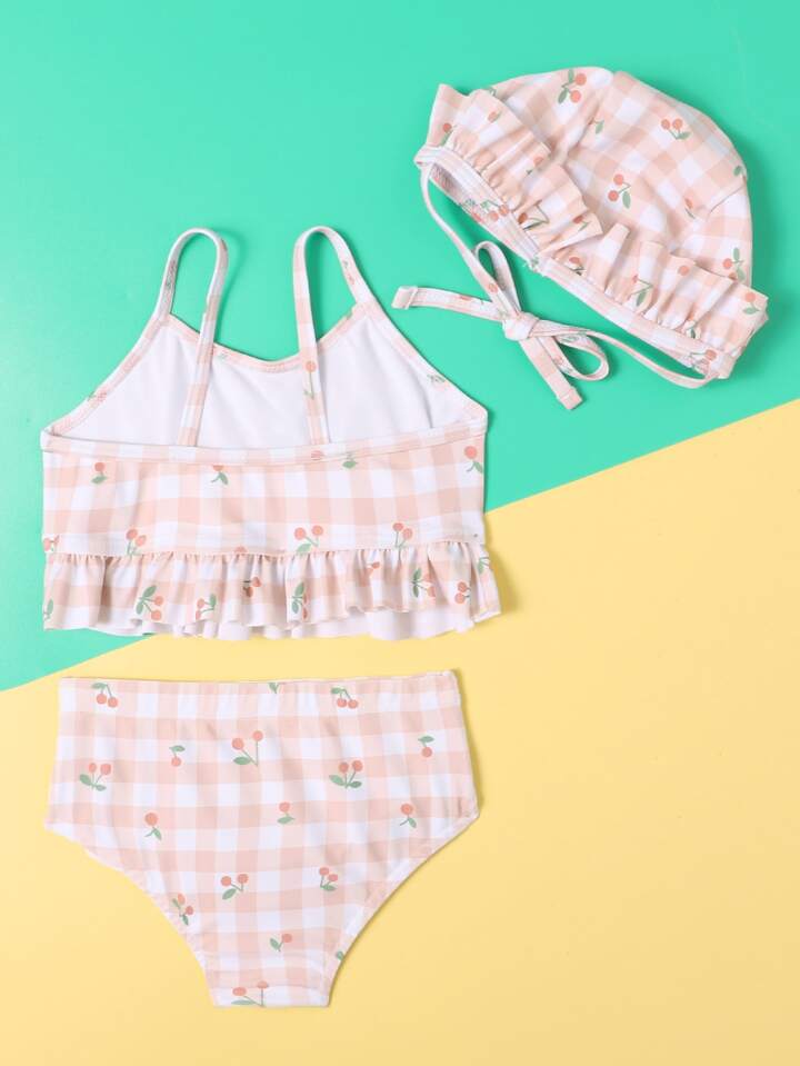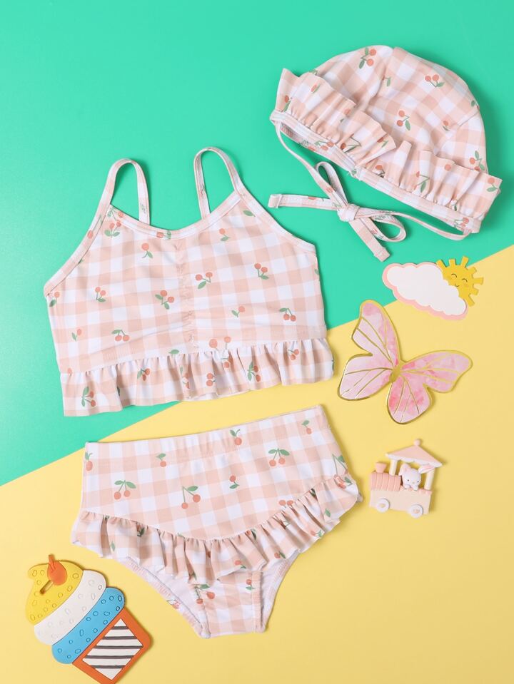 ملابس شاطئ وقبعة للبنات على شكل كرز وخطوط منقوشة للصيف