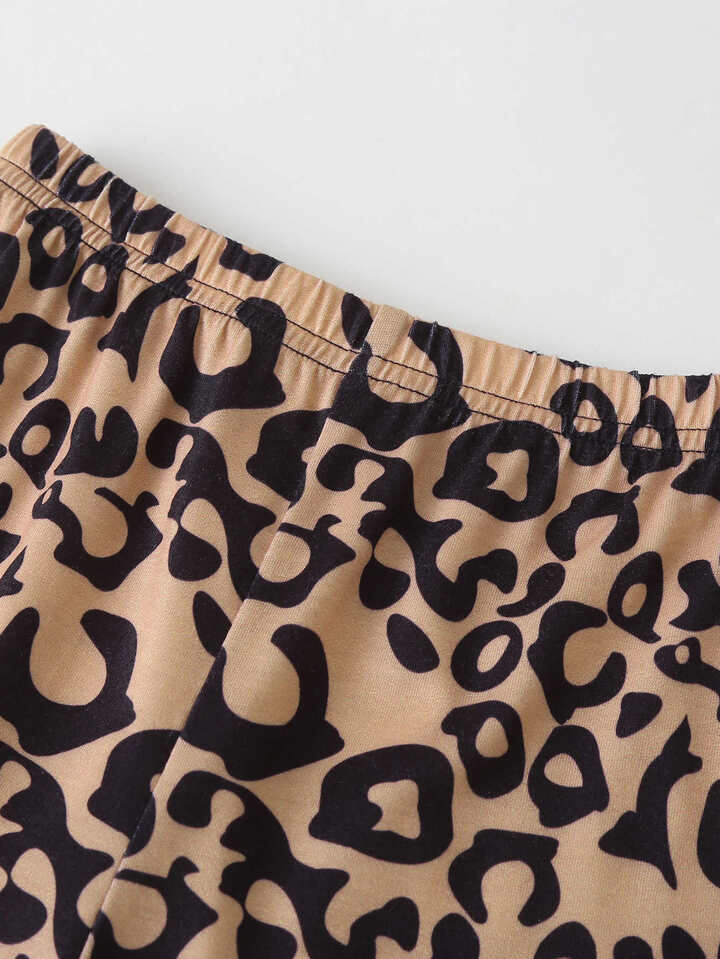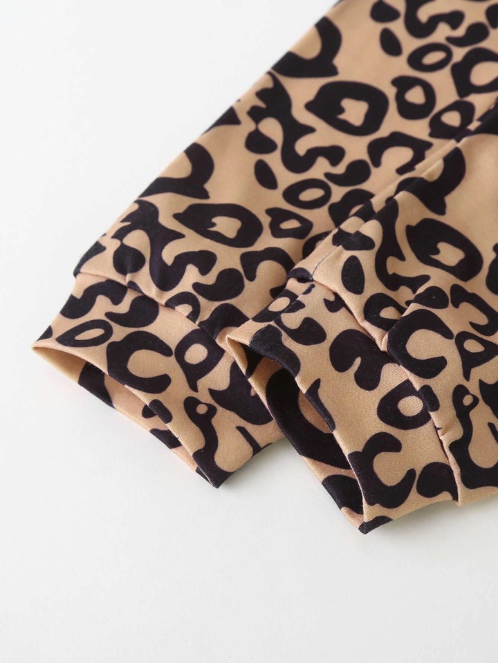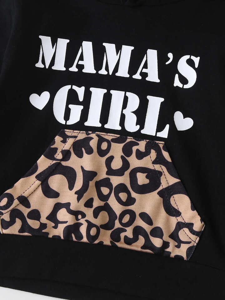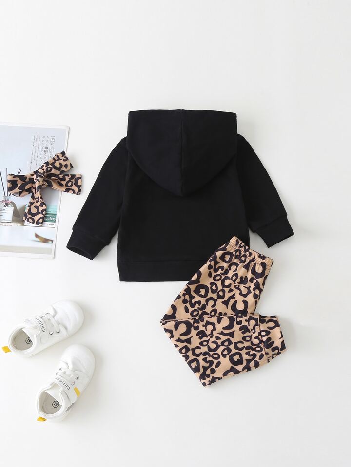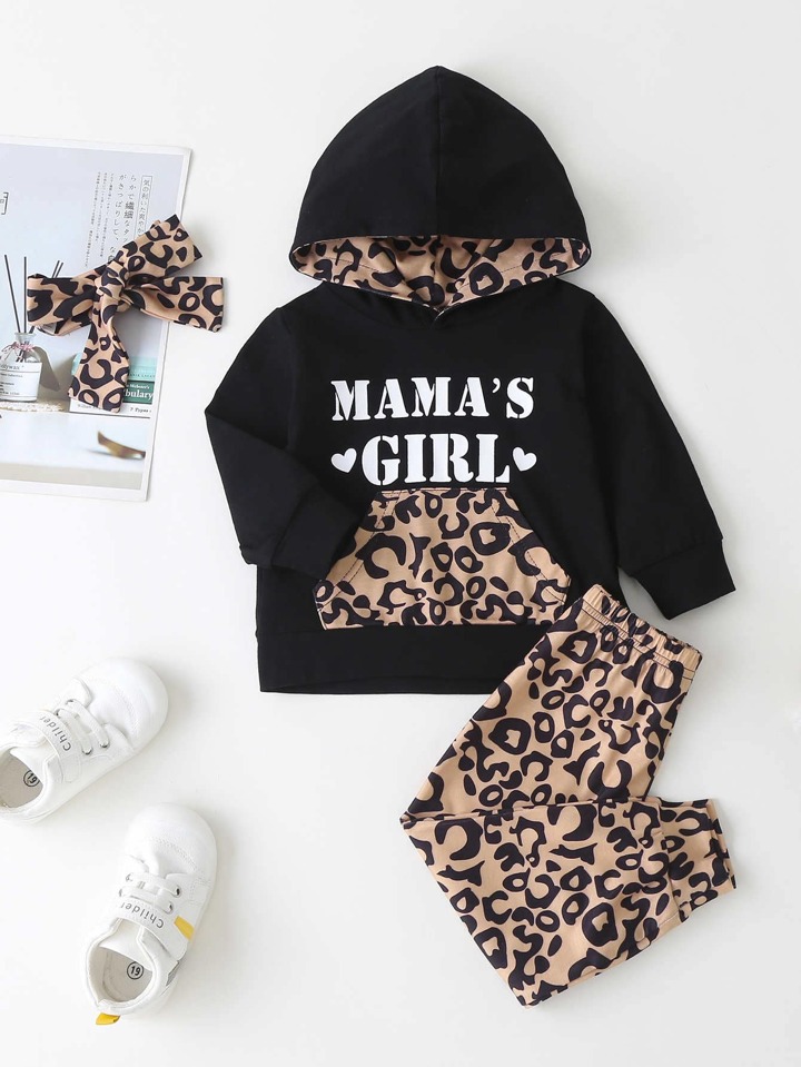 سروال نمط الفهد مع هودي بجرافيك عبارة مع عقال راس للبنات الاطفال