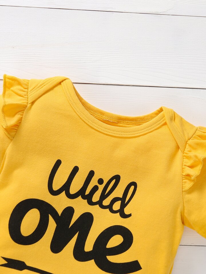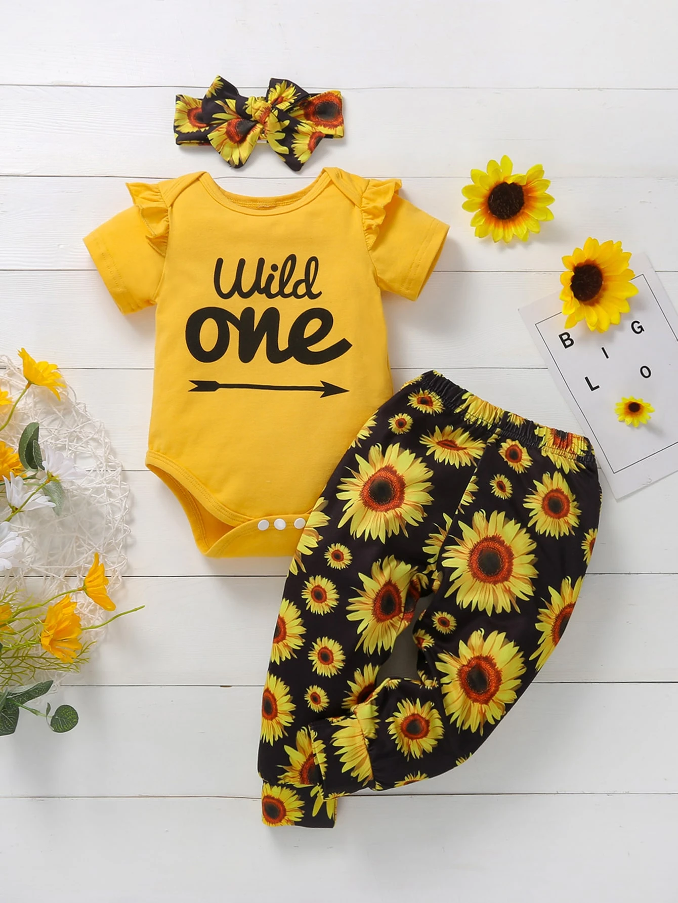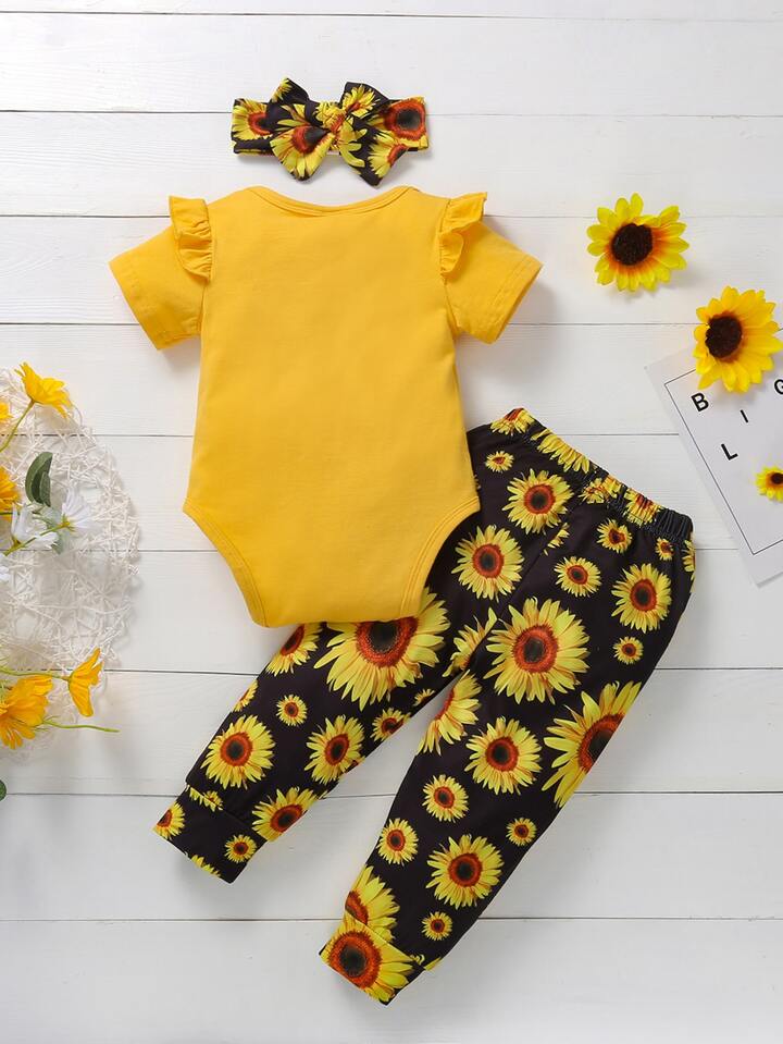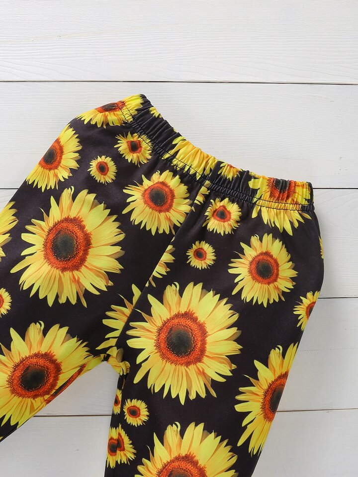 بنطلون زهرة دوار الشمس مع بدسويت مكشكش بجرافيك عبارة مع عصابة راس للبنات الأطفال