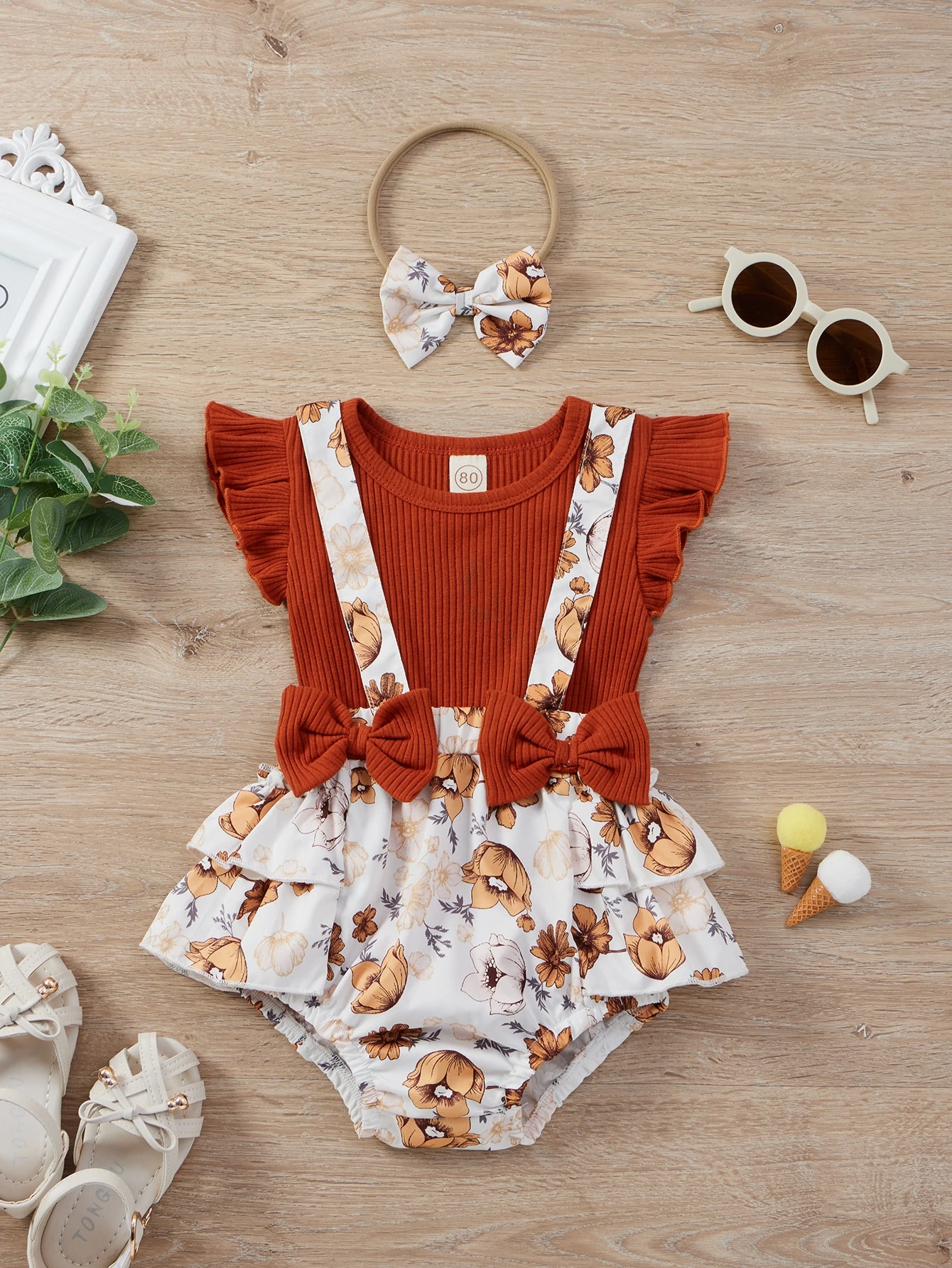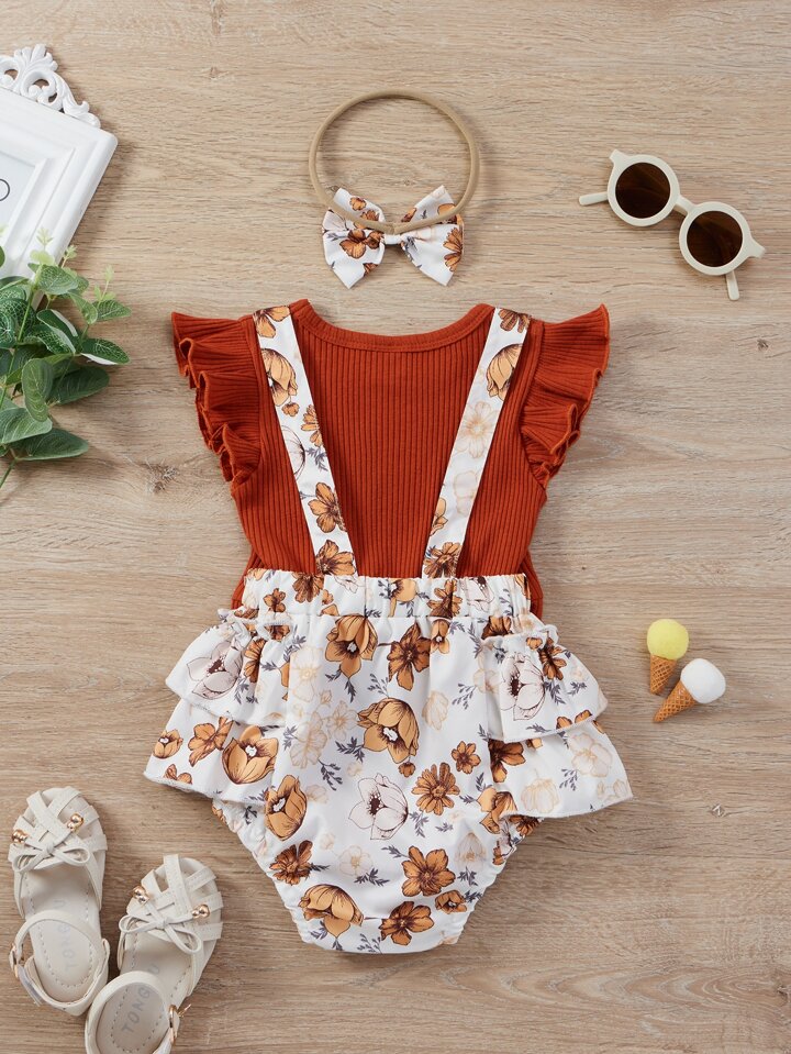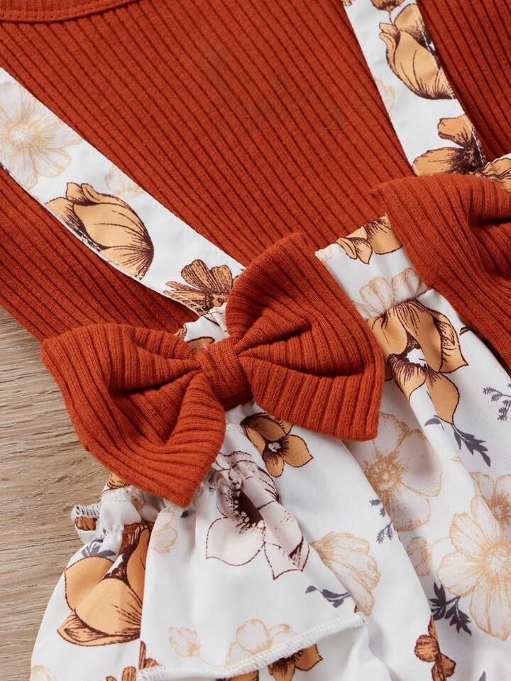 شورت بحمالات بقوس امامي مع بدسويت محبوك مضلع مع عصابة راس للبنات للاطفال