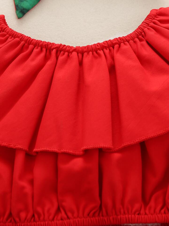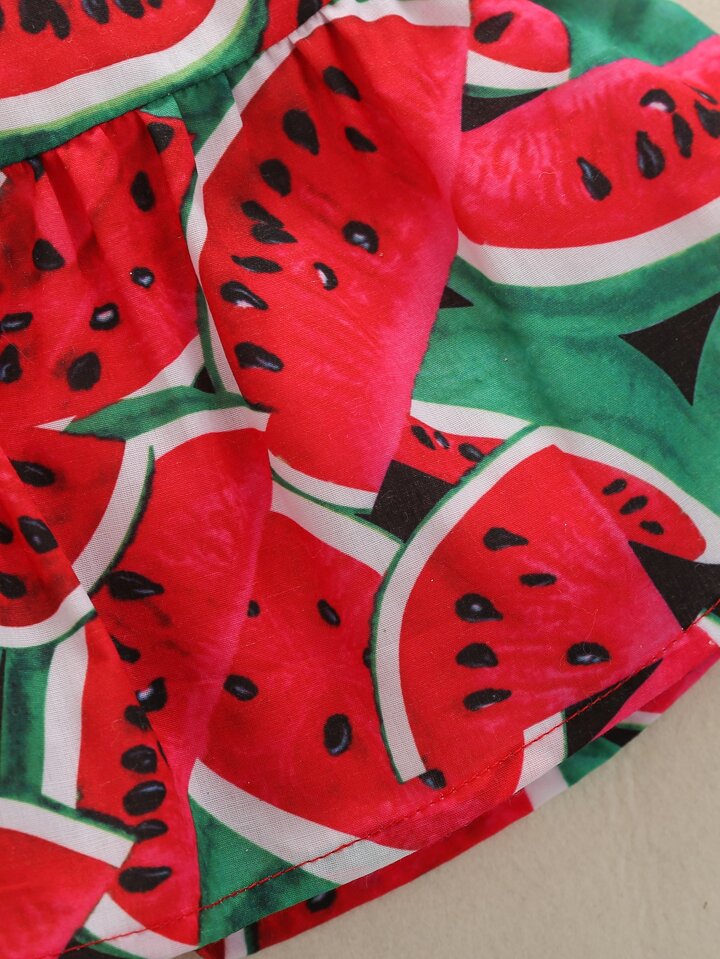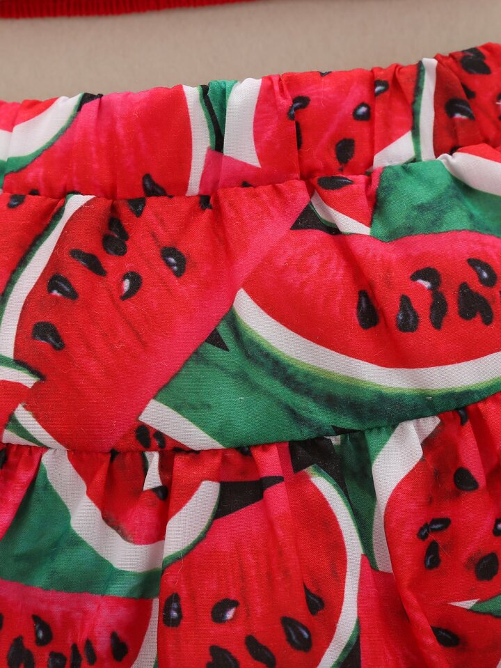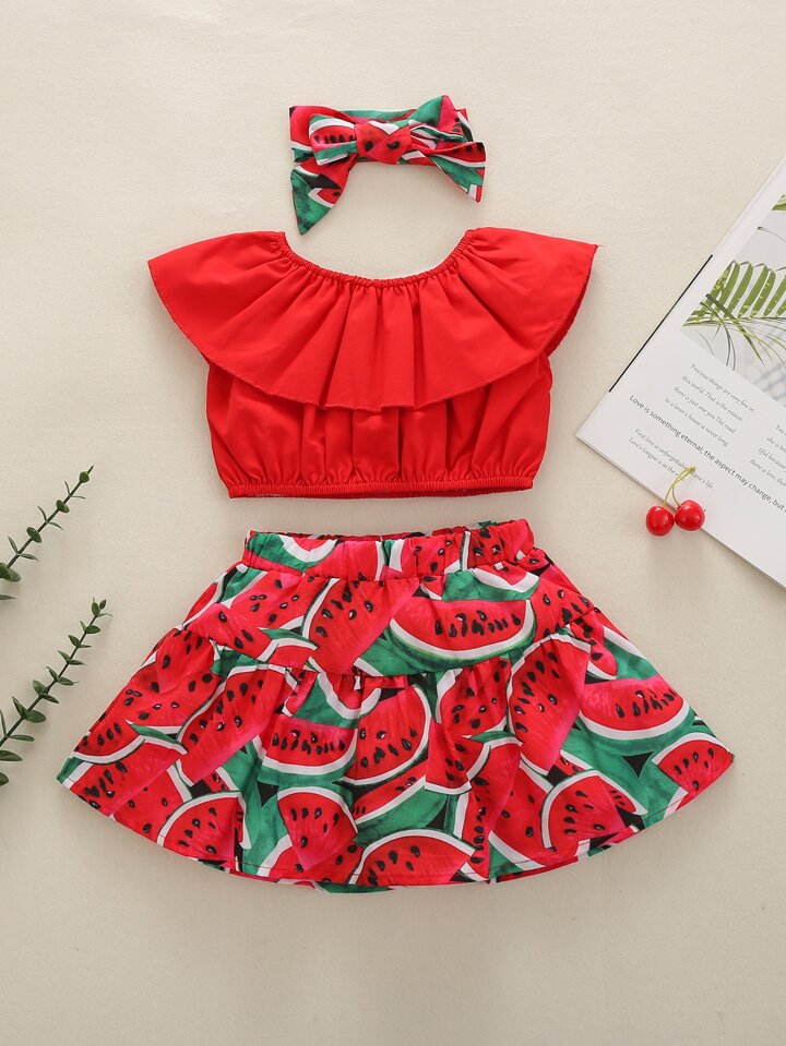 تنورة نمط بطيخ مع لباس علوي مقلم بكشكش مع عصابة راس للبنات للاطفال