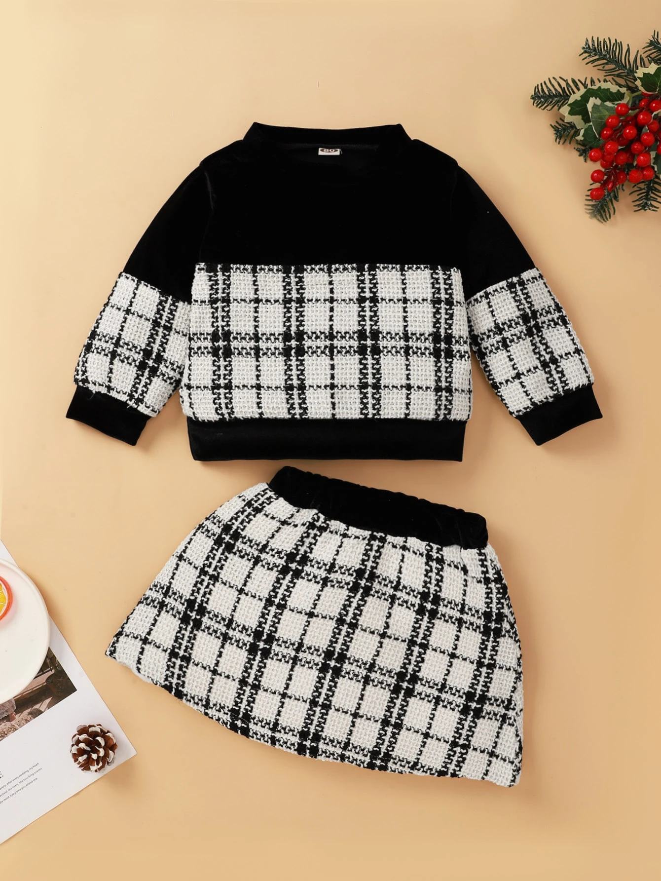 تنورة مع قميص ثقيل من التويد مربع النقش للبنات الرضع