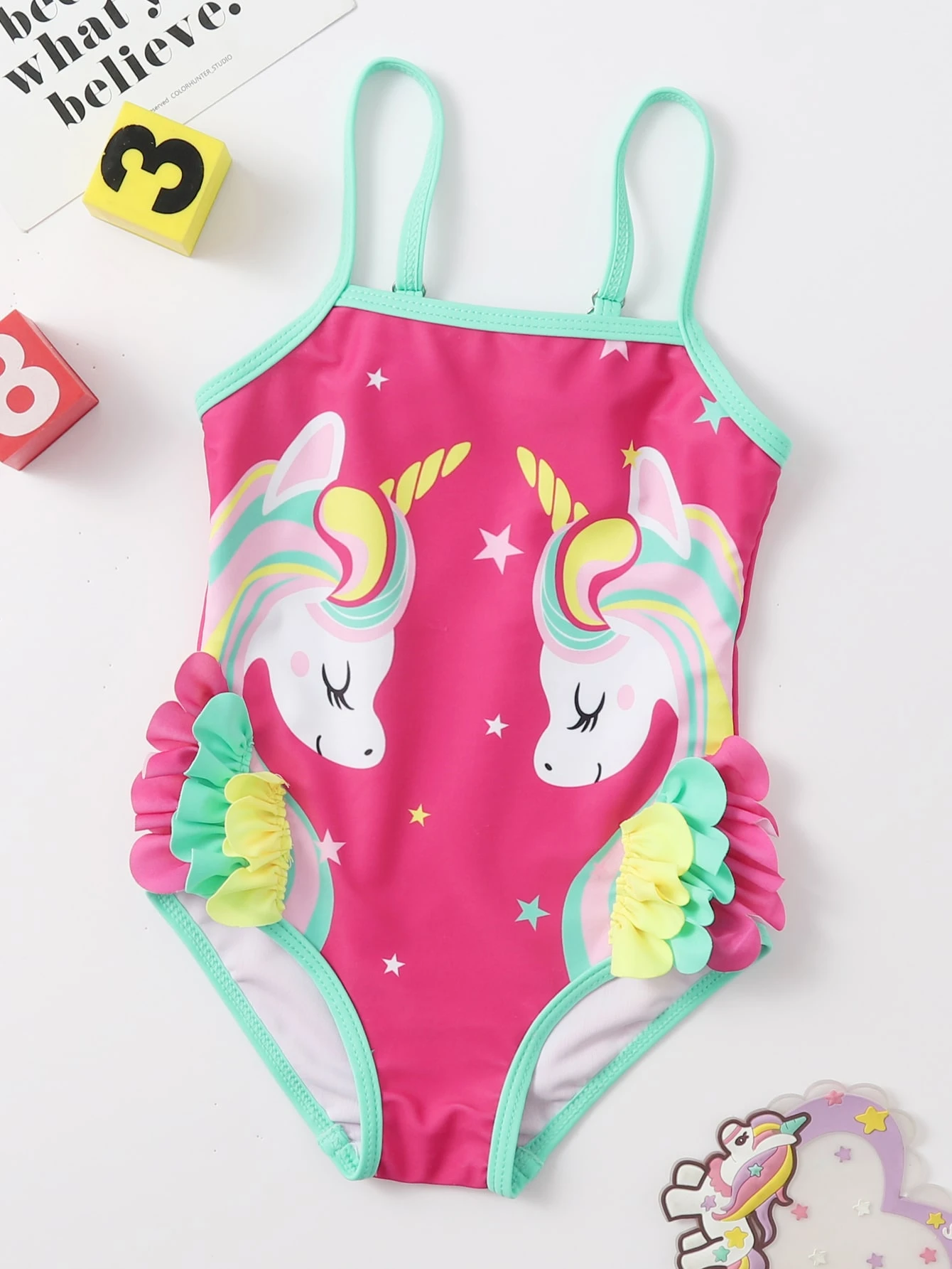 ملابس سباحة قطعة واحدة بطباعة وحيد القرن للبنات الرضع