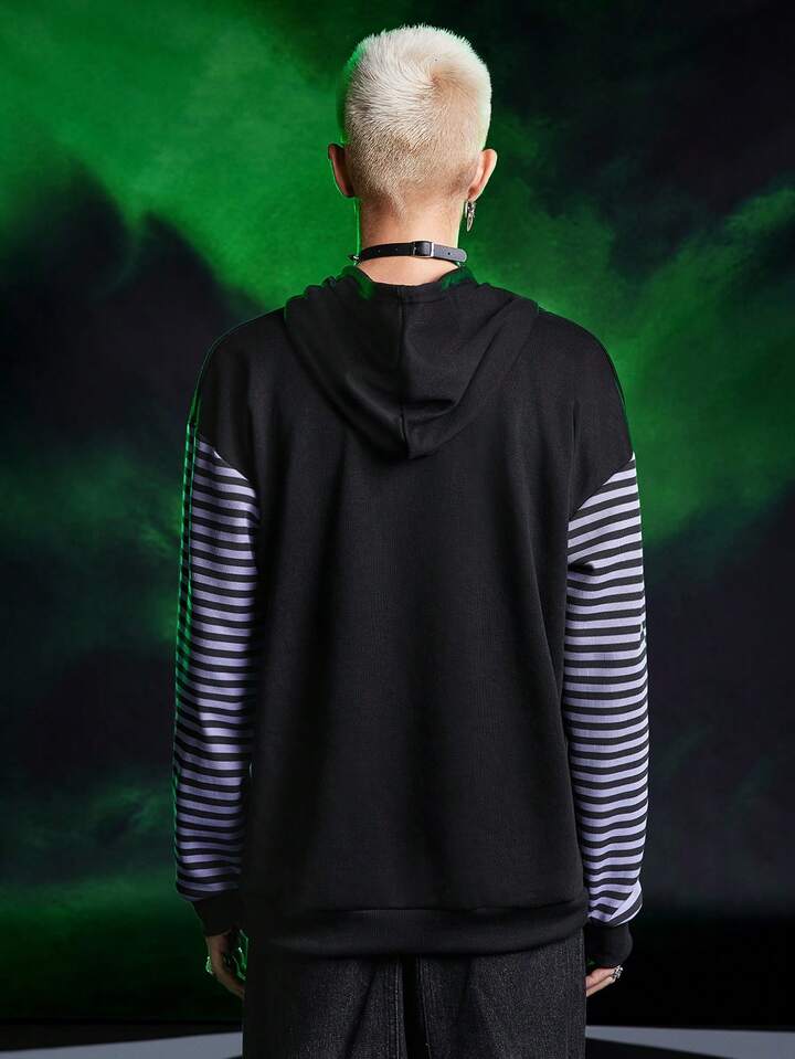 Beetlejuice | ROMWE بلوزة رياضية كاجوال للرجال بغطاء للرأس رباط خصر 2 في 1 بطباعة شخصية كرتونية وشعار على خطوط مختلفة، للربيع والخريف