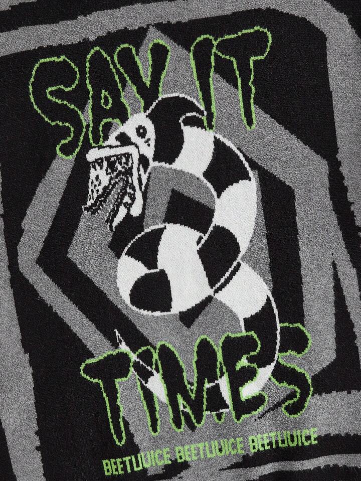 Beetlejuice | ROMWE كنزة صوفية مخططة بألوان متباينة ومزينة بشعار الوحش على شكل دوامة قياس كبير