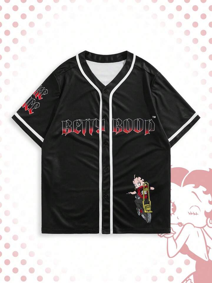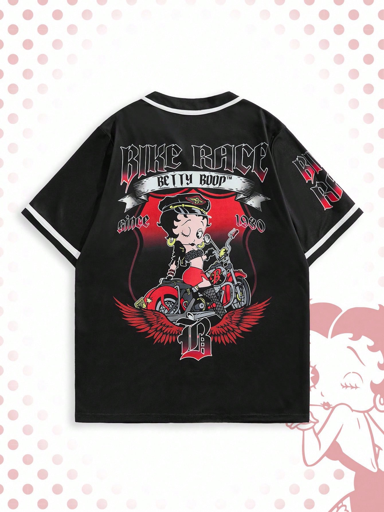 Betty Boop | ROMWE ملابس علوية رجالي مخصص وأنيق: ملابس علوية أسود بطراز البيسبول مطبوع بطباعة الدراجات النارية بياقة على شكل حرف V وأزرار