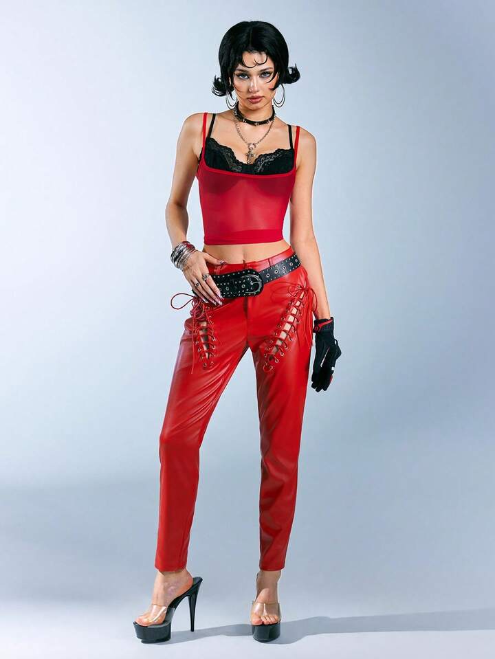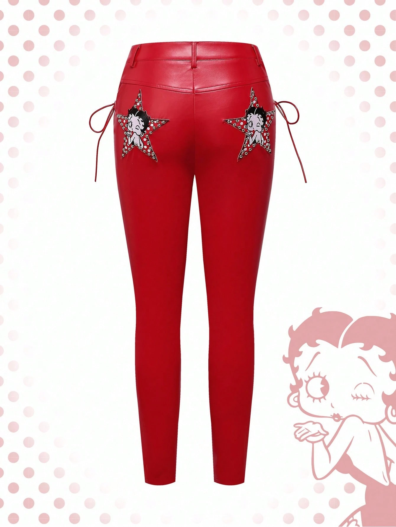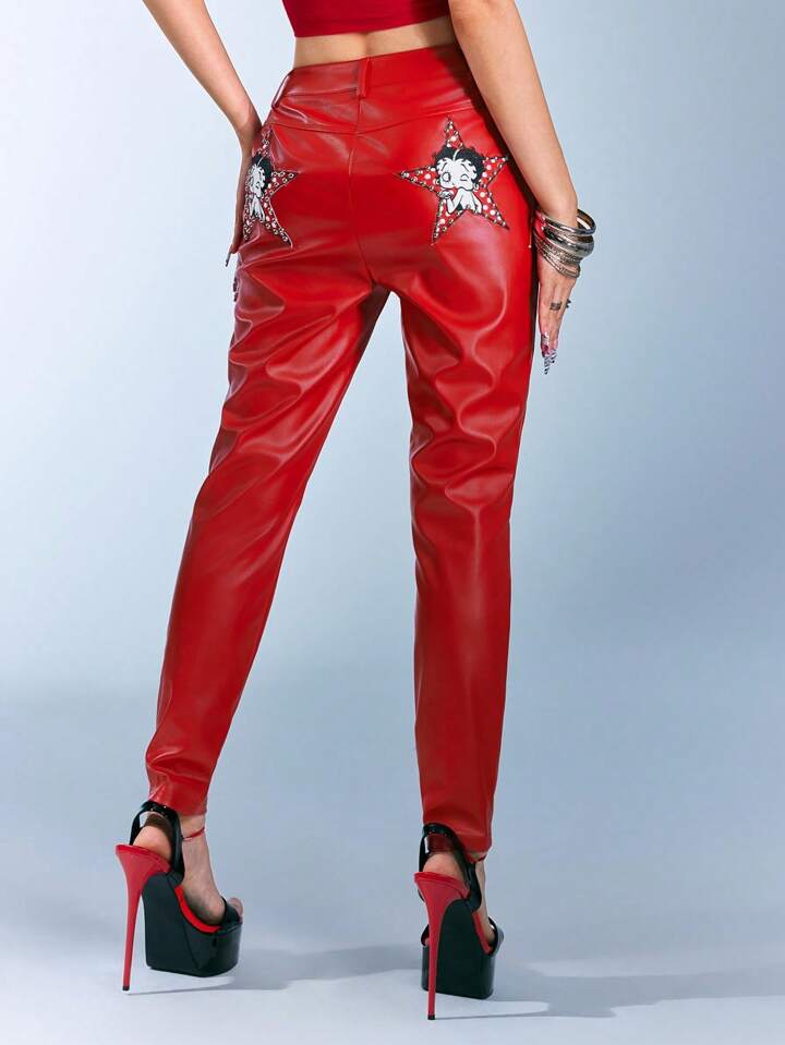 Betty Boop | ROMWE سروال جلد PU مطبوع بنقوش الفتاة ونجوم وأشكال كرتونية مزين بأشرطة صغيرة معدنية، لملابس الشارع الملائمة للدراجات النارية اللون: أحمر