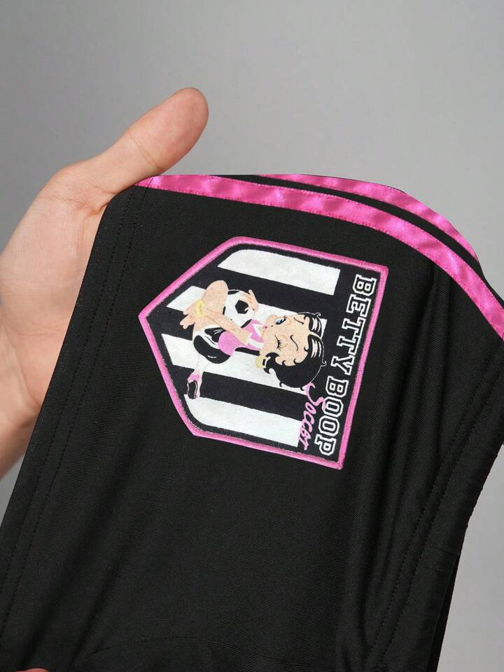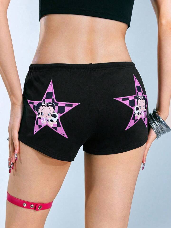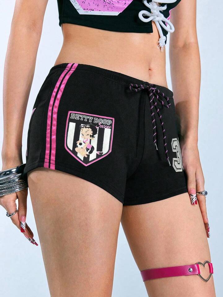 Betty Boop | ROMWE شورت صيفي كاجوال بخصر رباط، طباعة شخصيات كرتونية وأرقام، تصميم جانبي مخطط متباين، أسلوب الدراجات النارية الشيك