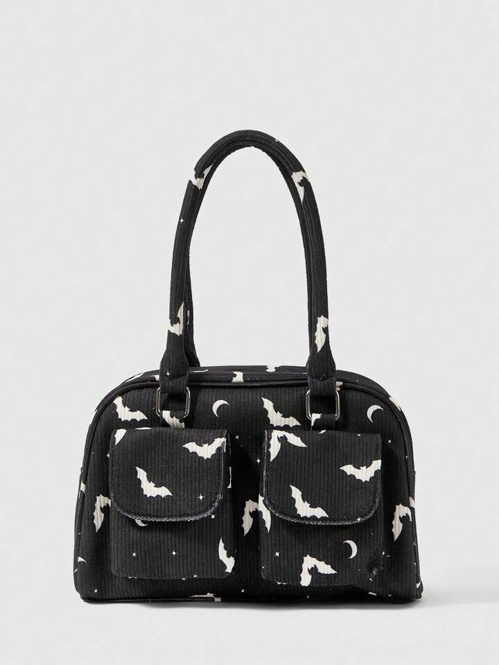 Goth حقيبة كتف تحت الإبط مطبوع عليها تصميم الخفافيش السوداء بطراز قوطي، ذات جيوب متعددة، حقيبة كتف بوسطن محمولة للنساء