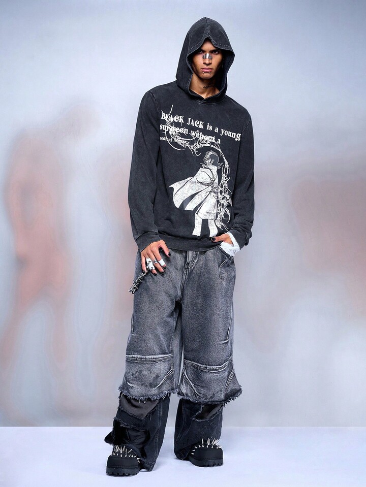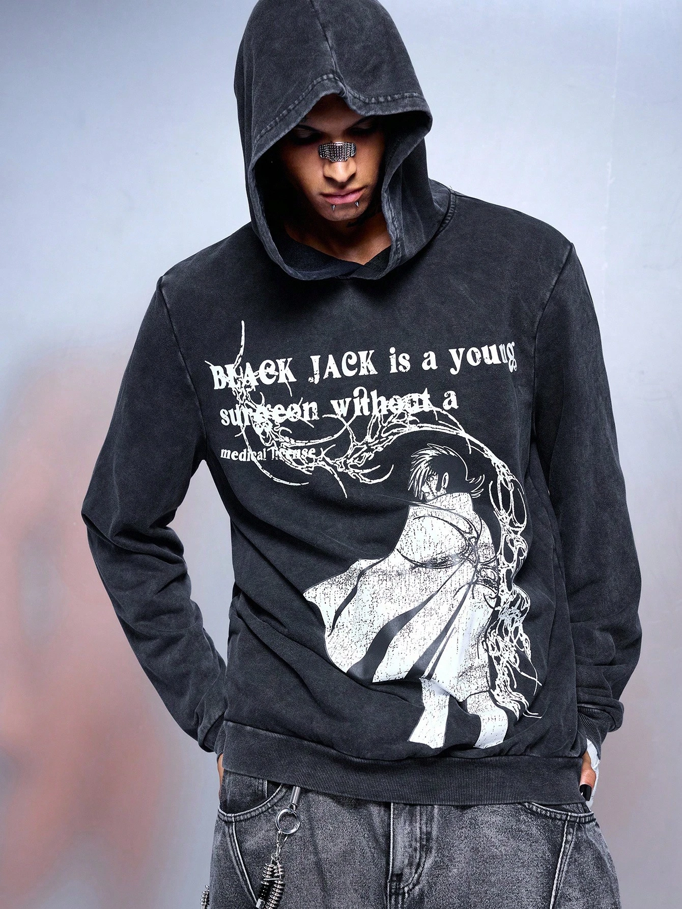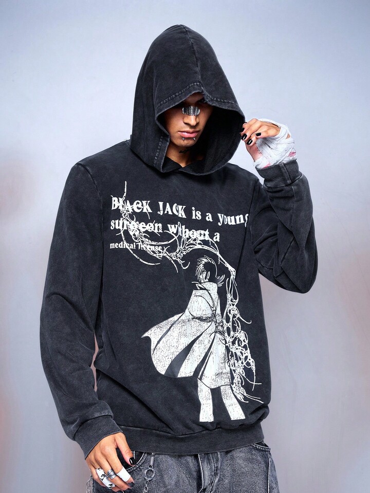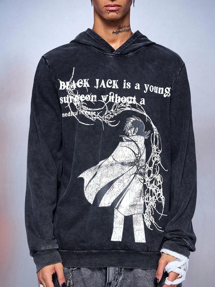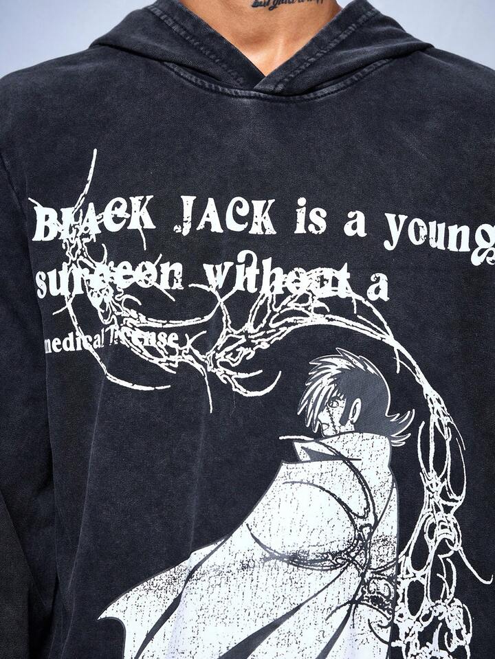 Black Jack X ROMWE بلوزة رجالية هوديي بطباعة رجعية أنمي، مناسبة للخريف/الشتاء