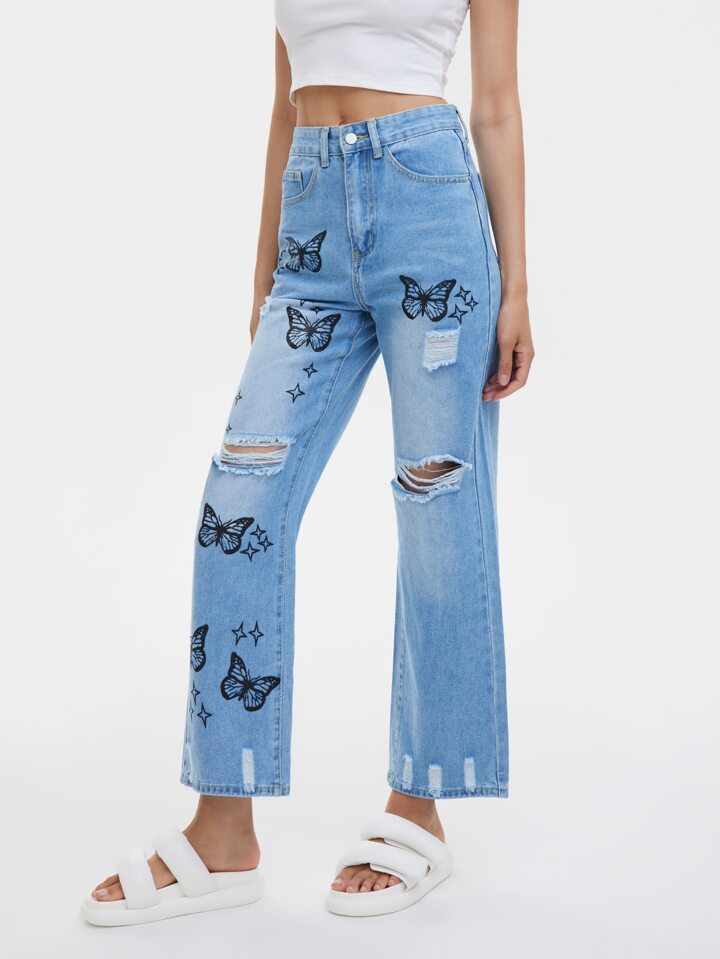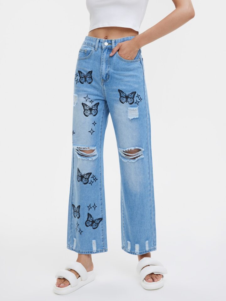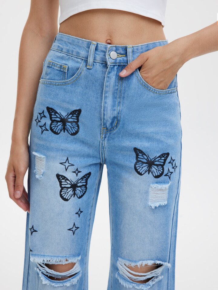 بنطلون جينز فراشة بتفاصيل ممزق ازرق فاتح