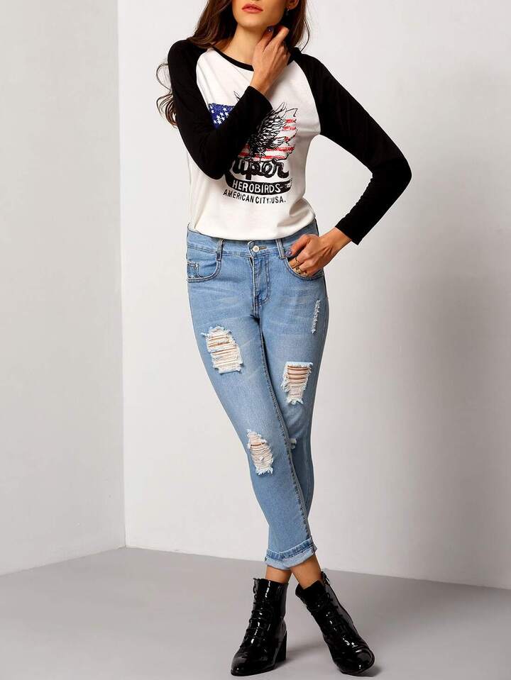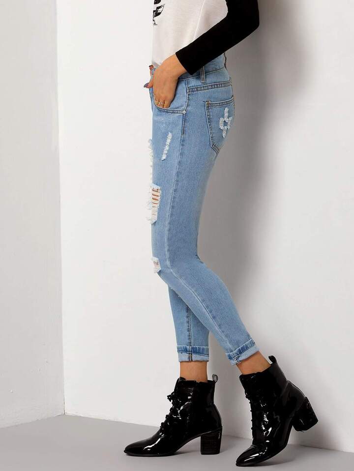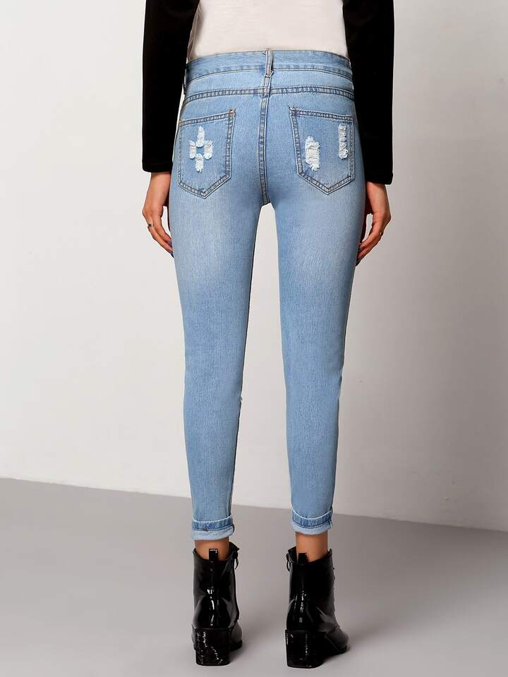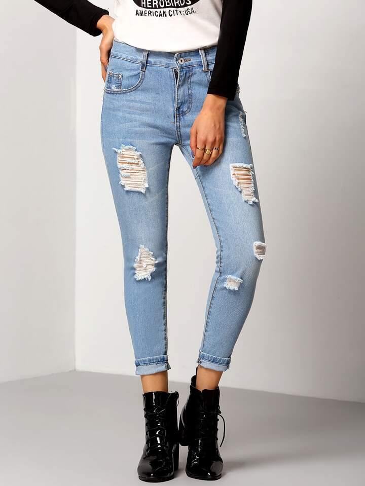 بنطال دنيم أزرق ضيق موضة مُمزقة