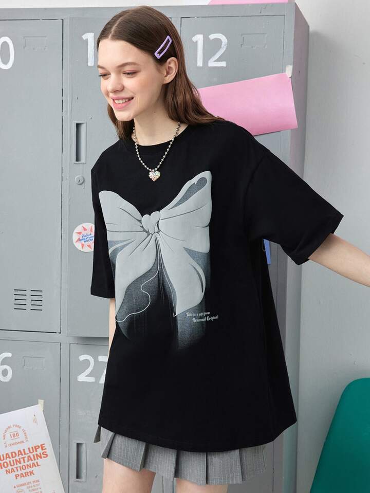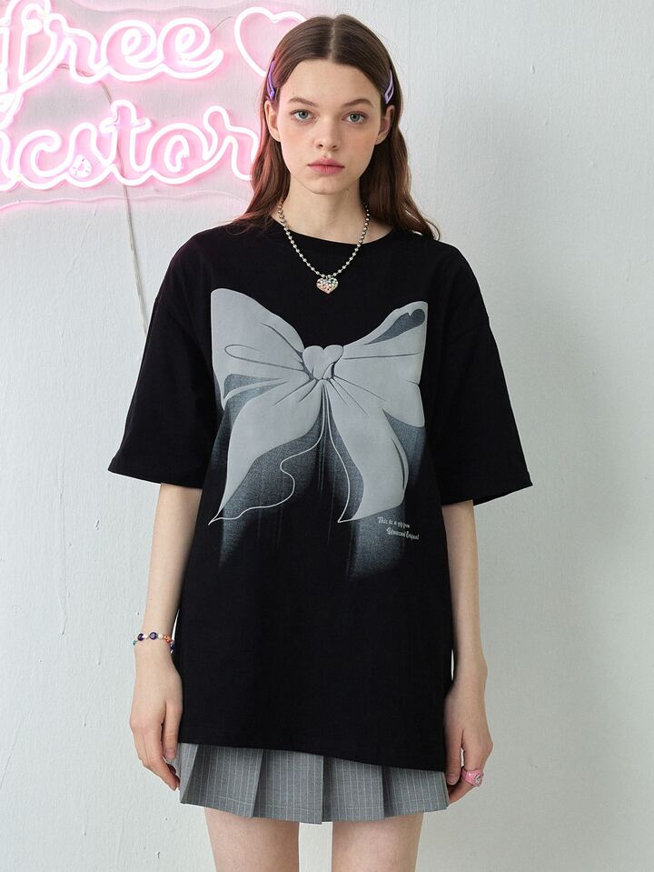 تي شيرت منخفض الاكتاف قوس مع بطباعة شعار