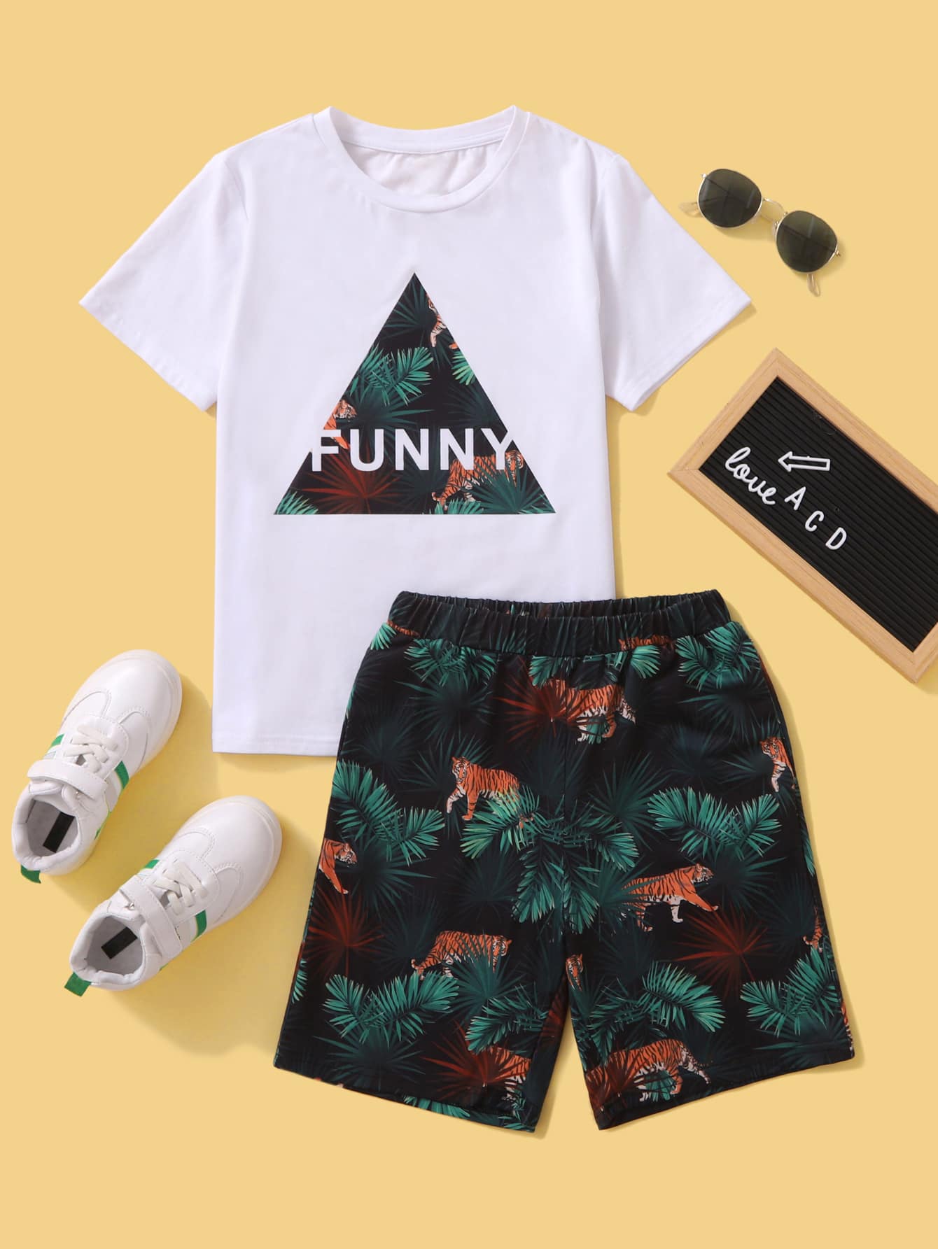شورت مع تي شيرت بجرافيك نمر وعبارة للأولاد