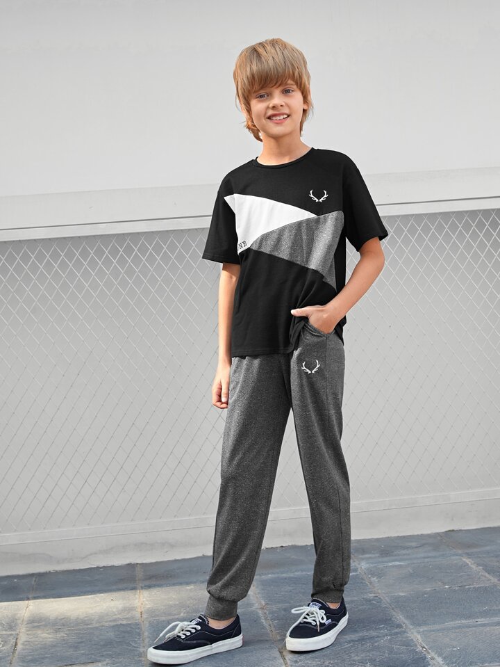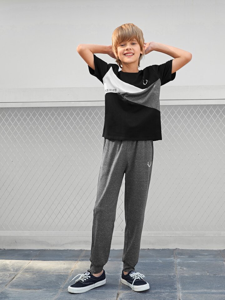 طقم بنطلون مع لباس علوي بألوان متجانس وبجرافيك عبارة للاولاد