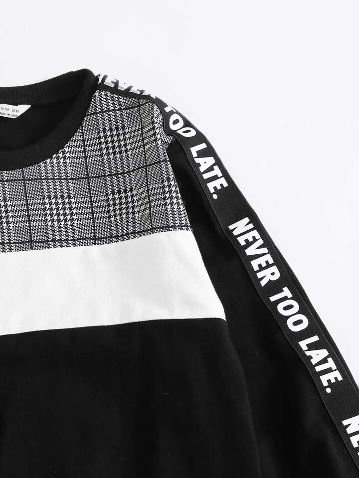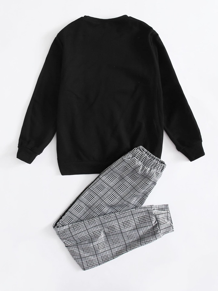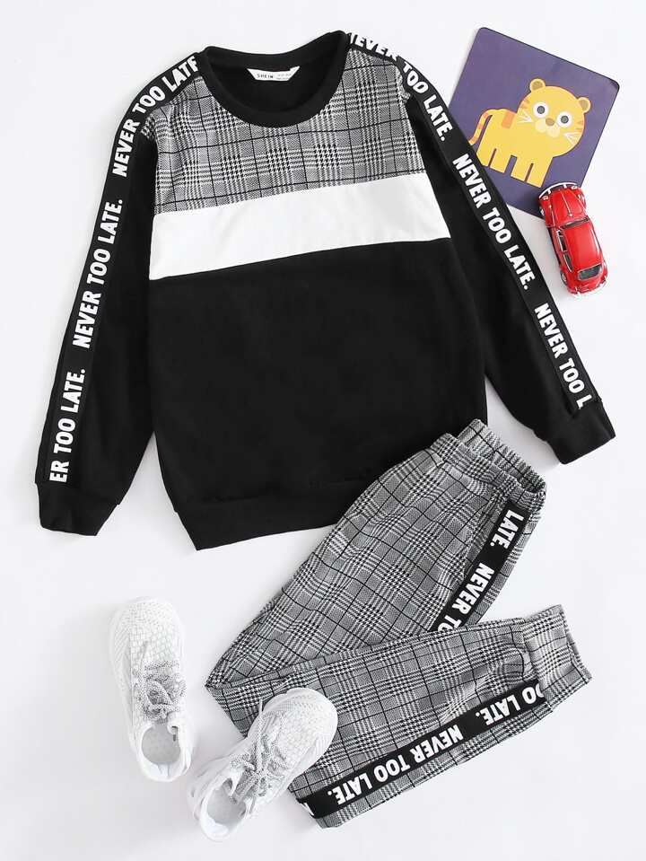 طقم بنطلون رياضي مربع النقش مع بلوفر بشريط جانبي بجرافيك شعار للاولاد