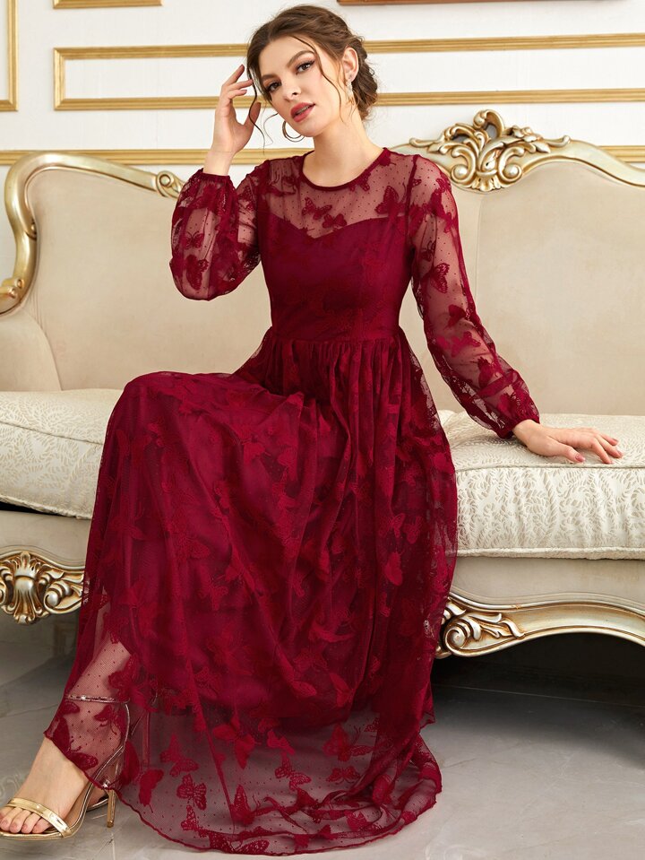 فستان سهرة طويل طراز ماكسي للنساء بأكمام فوانيس شبكية مطرزة بفراشات باللون البرغندي الأحمر