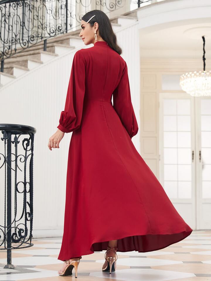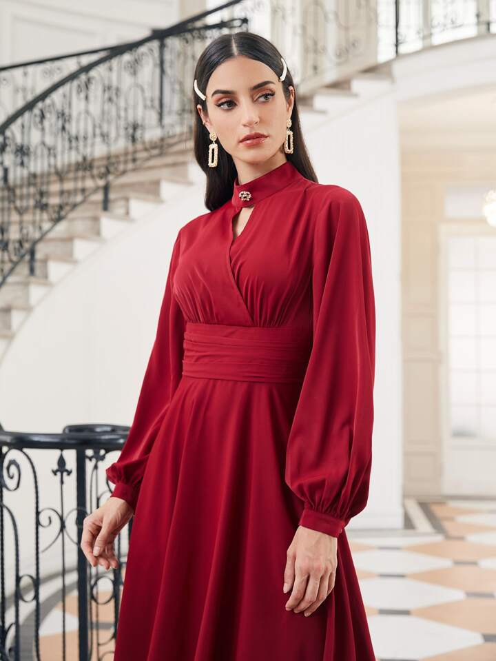 فستان متواضع بأكمام طويلة بقصة بشوب بلون أحمر داكن