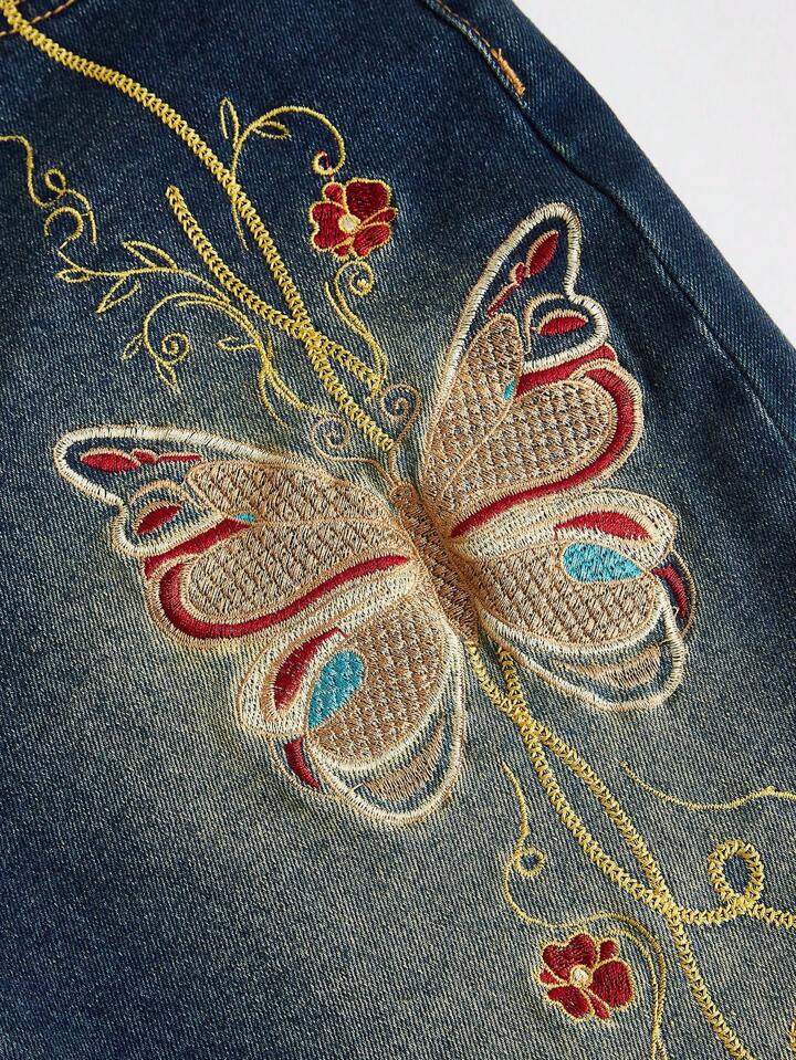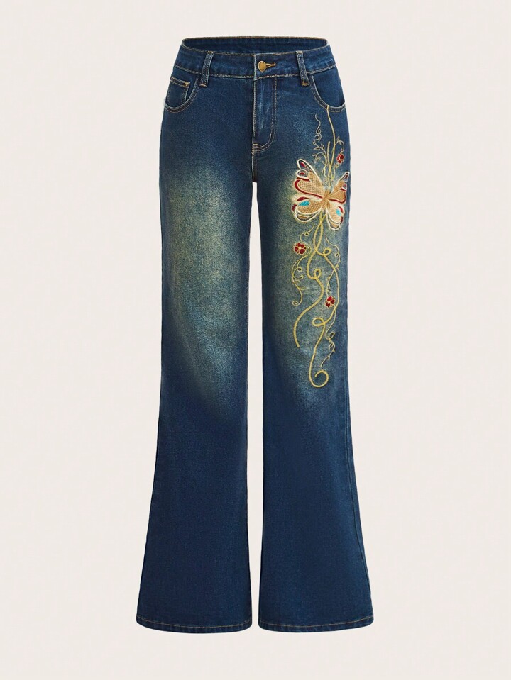 بنطلون جينز واسع من الاسفل مطرز بفراشة