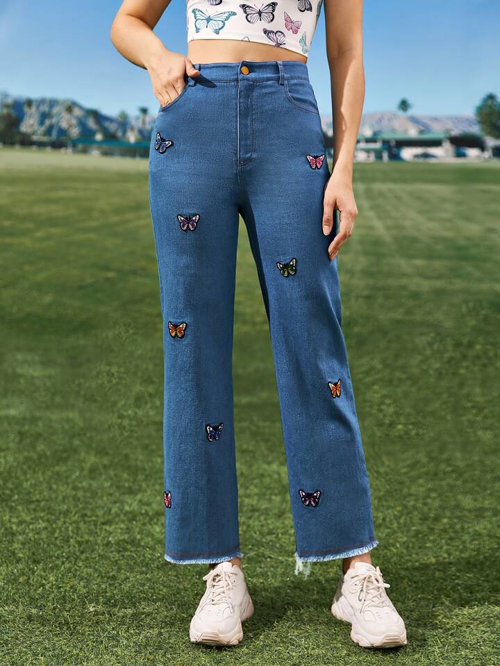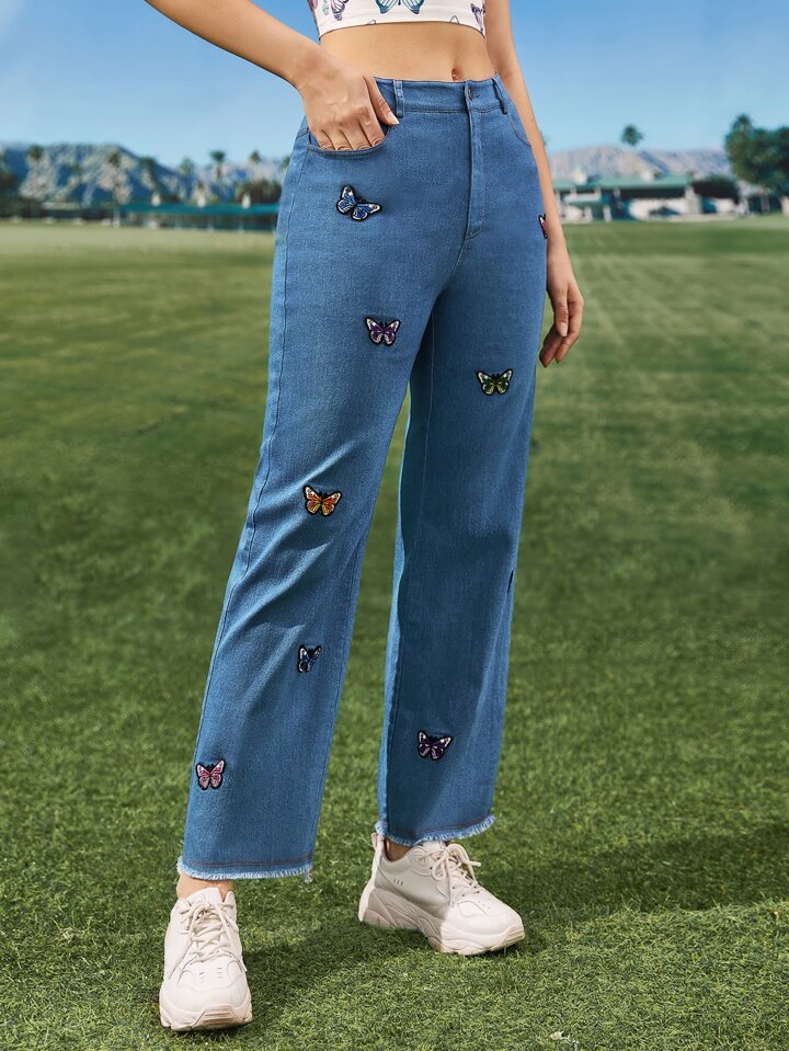 بنطلون بحافة خام مرقع بفراشة