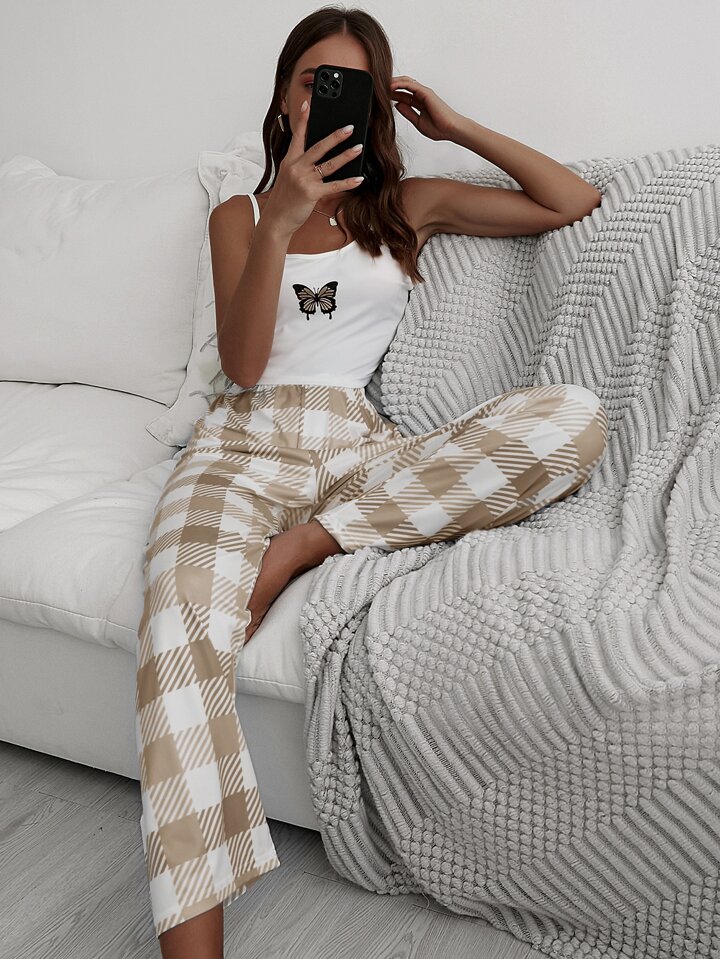 بطباعة الفراشة صدرية كامي و عقدة الفراشة أمامية مربعات ملونة بنطلون